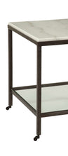 The Whitman Square End Table features a striking contrast between bronze and ivory marble. The solid stone tops rests on a steel base and features piano casters for added functionality. This square end table is accented with a clear glass shelf for extra storage.