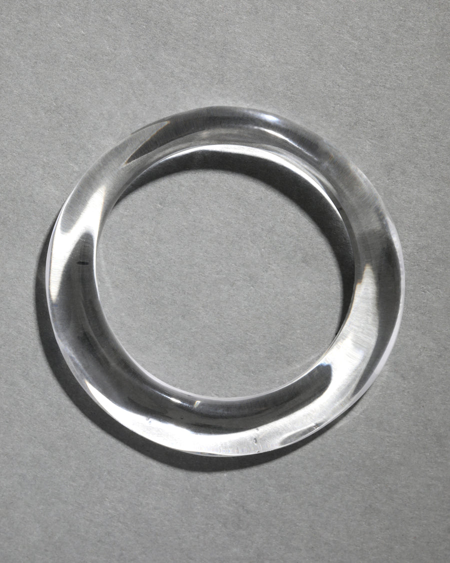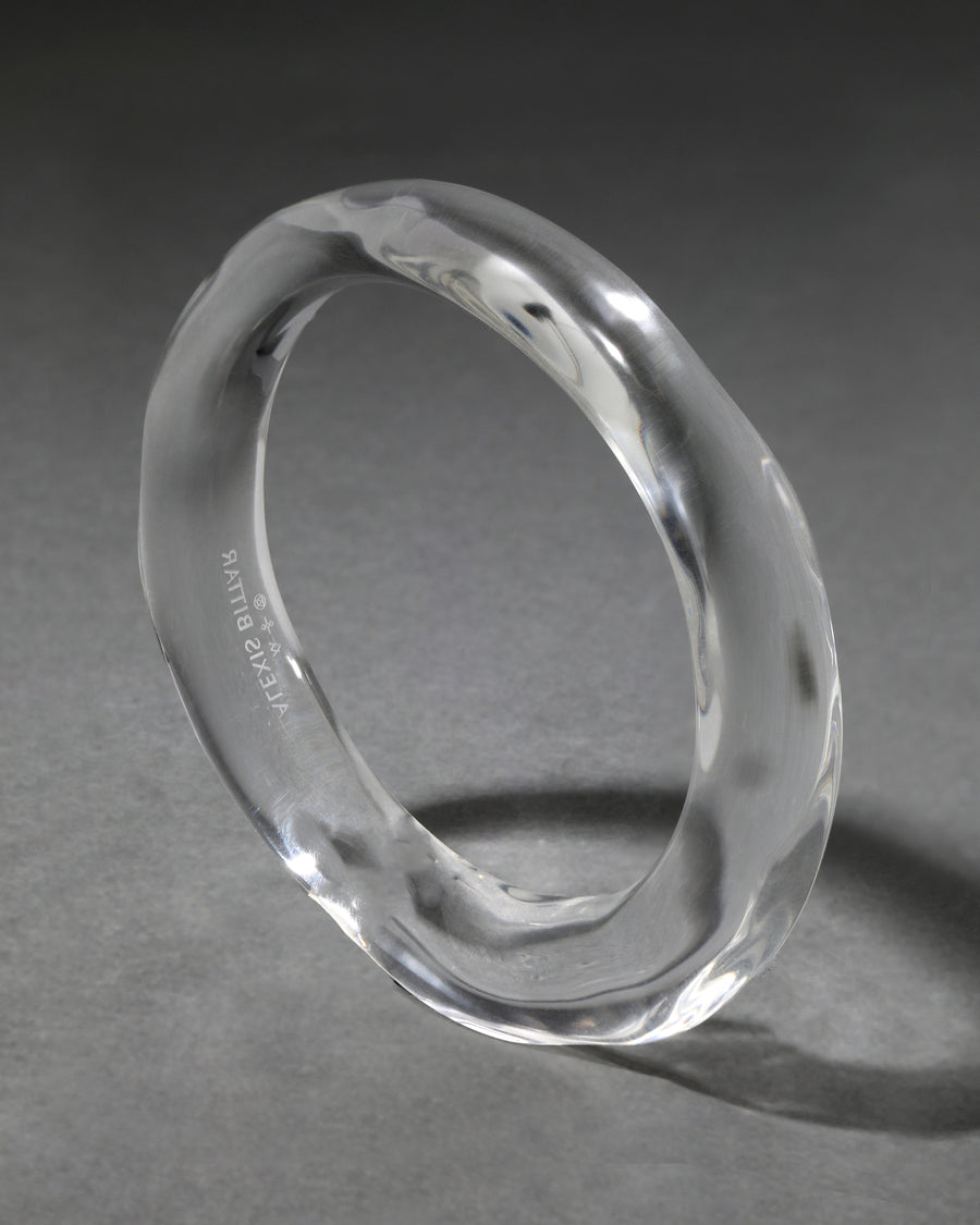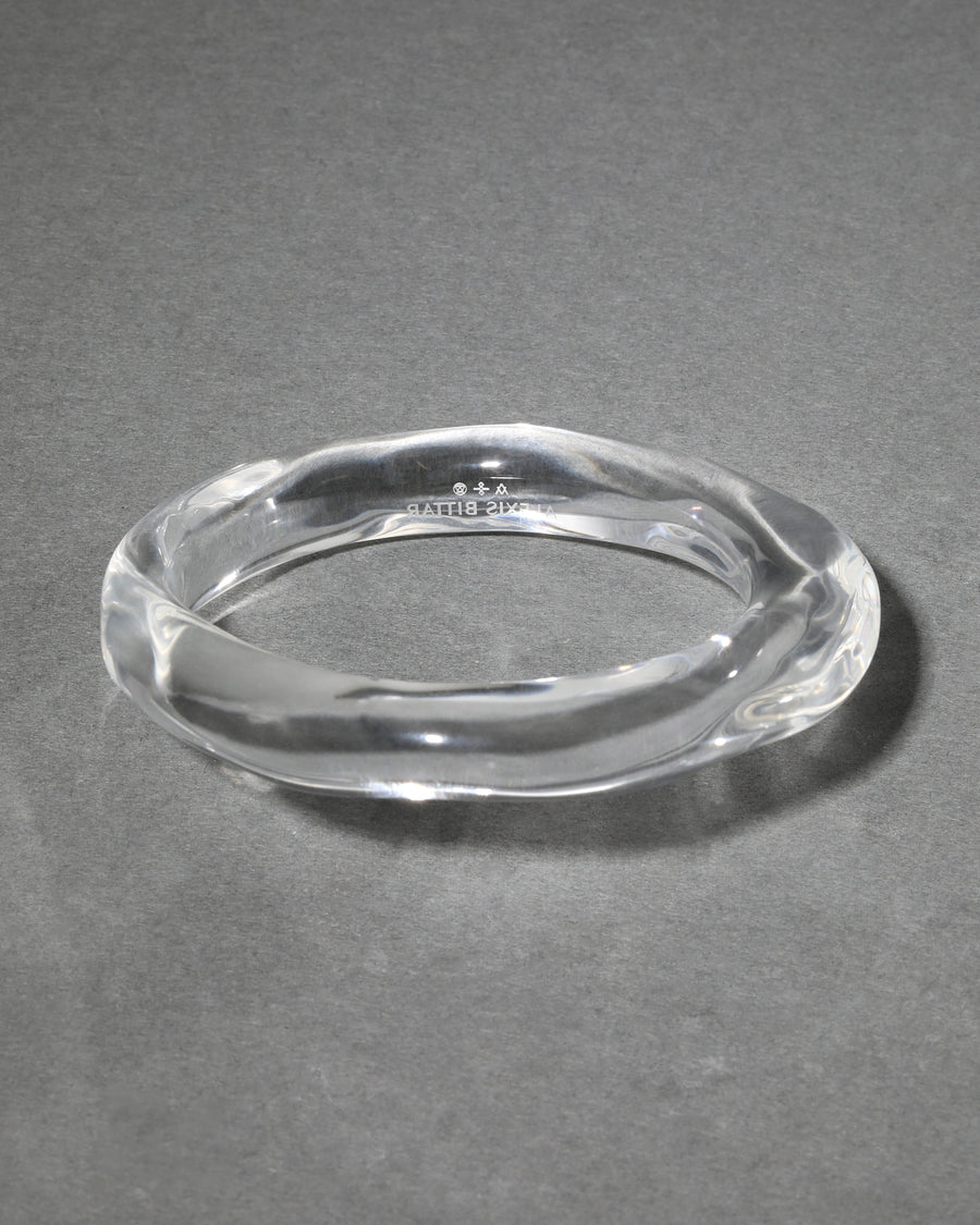 Inspired by the fluidity of water in motion, this hand-sculpted liquid Lucite bangle orbits the wrist with watery radiance from its hand-polished gleaming silhouette. Perfect for stacking or as a single statement.