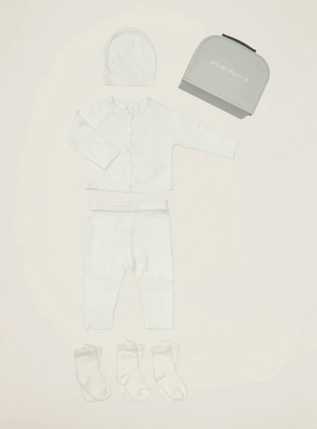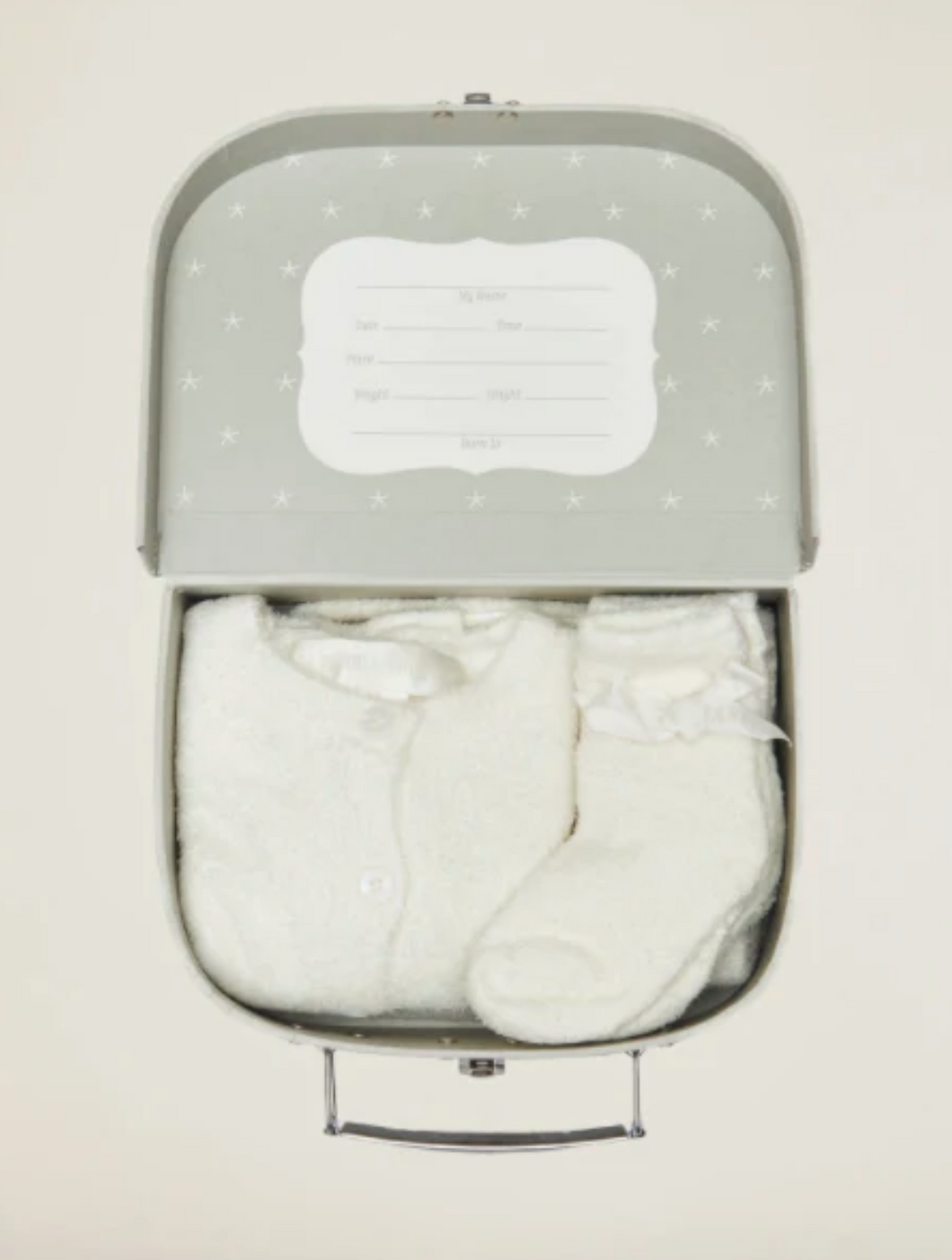 Coming home from the hospital just got sweeter with our Heirloom Newborn Set. This is every newborn's must have when it comes to being enveloped in super soft, luxurious coziness for their first trip home. Each suitcase ensemble includes a CozyChic Lite cardigan, pull on pant, beanie and three pairs of socks.The suitcase doubles as the perfect keepsake box that details important info; Name, Date, Time, Place, Height, Weight and Born to.
