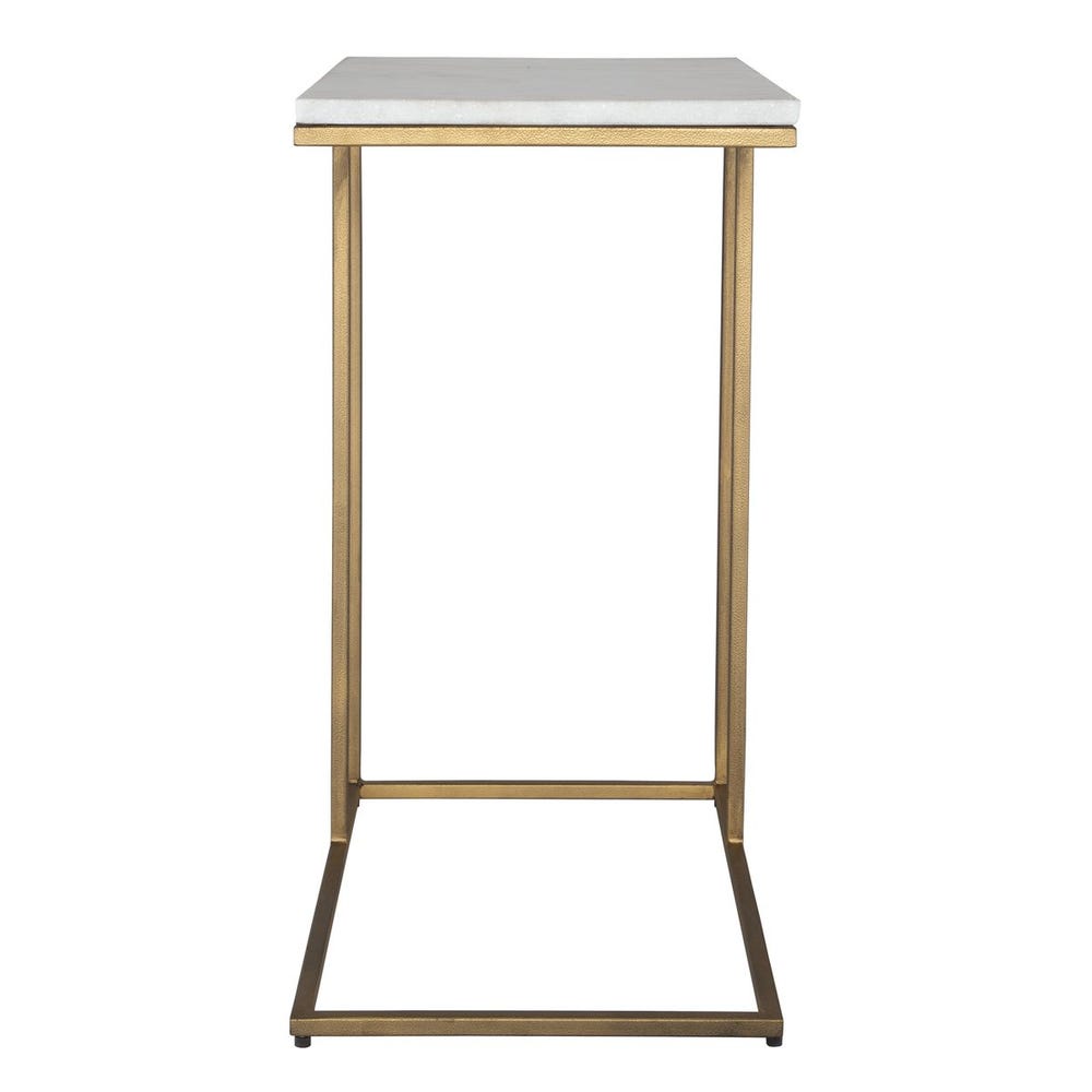 This perfectly sized accent table, with it's open design, will look great beside your favorite chair. The antique brass metal frame is topped with a beautiful piece of white Morwad honed marble. Natural gray veining is throughout, making each piece a little bit unique.