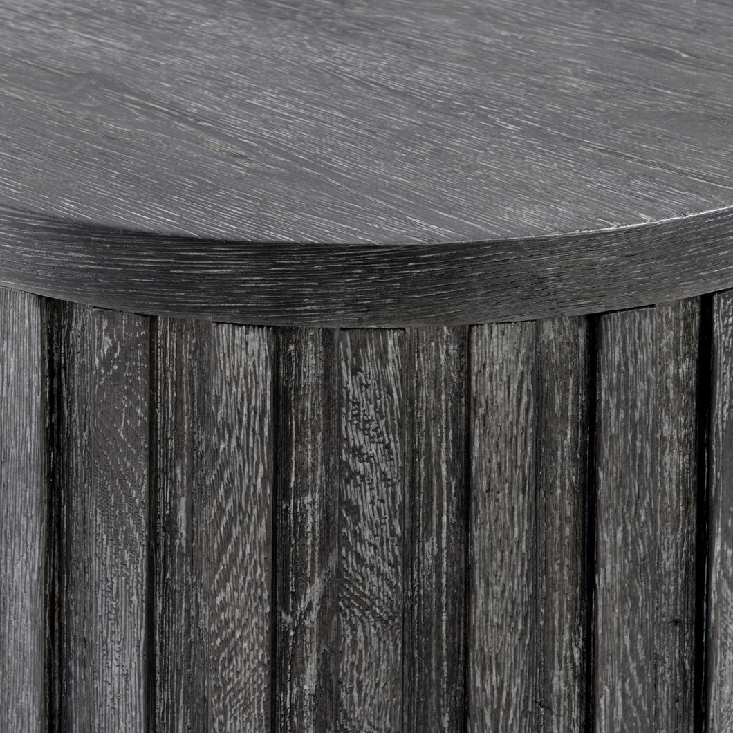 Inspired by a classic drum shape, the Menton accent table features deep linear reeding on the sides and a smooth table surface. The design is casual and modern, with an elevated appeal. The deeply textured woodgrain is highlighted by our Sutton finish.