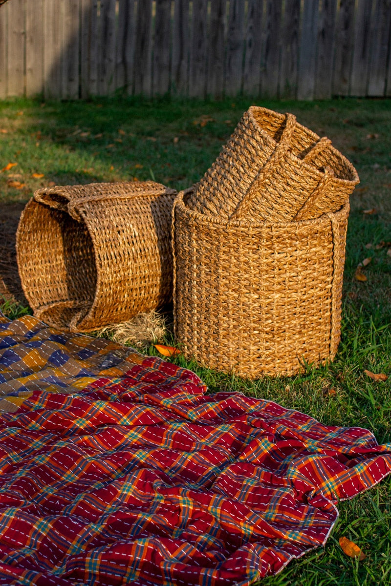 This medium round braided seagrass basket with handles is great for storing! The stiffness of the seagrass and the flat bottom allows it to stand upright. The convenient handles and the natural color make it perfect for any décor. Use for blankets, firewood, yarn.