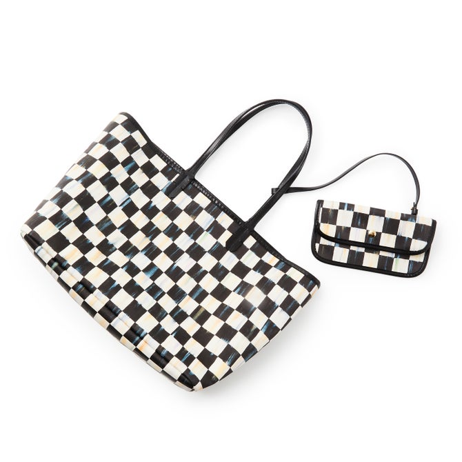 Take MacKenzie-Childs wherever you go with the Courtly Check® Marche Medium Tote. This flat-bottom bag, made of a laminated canvas featuring our signature check, has leather straps and a detachable pouch that can hold credit cards, eyeglasses, or a cell phone.
