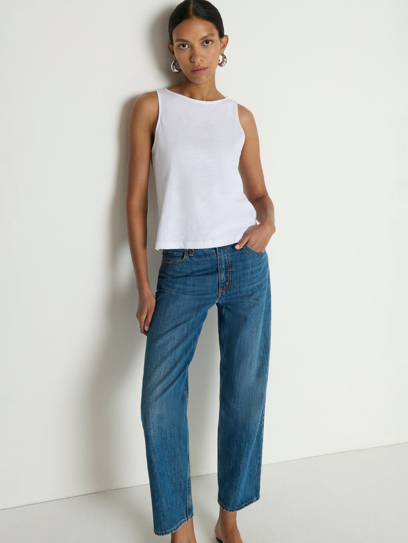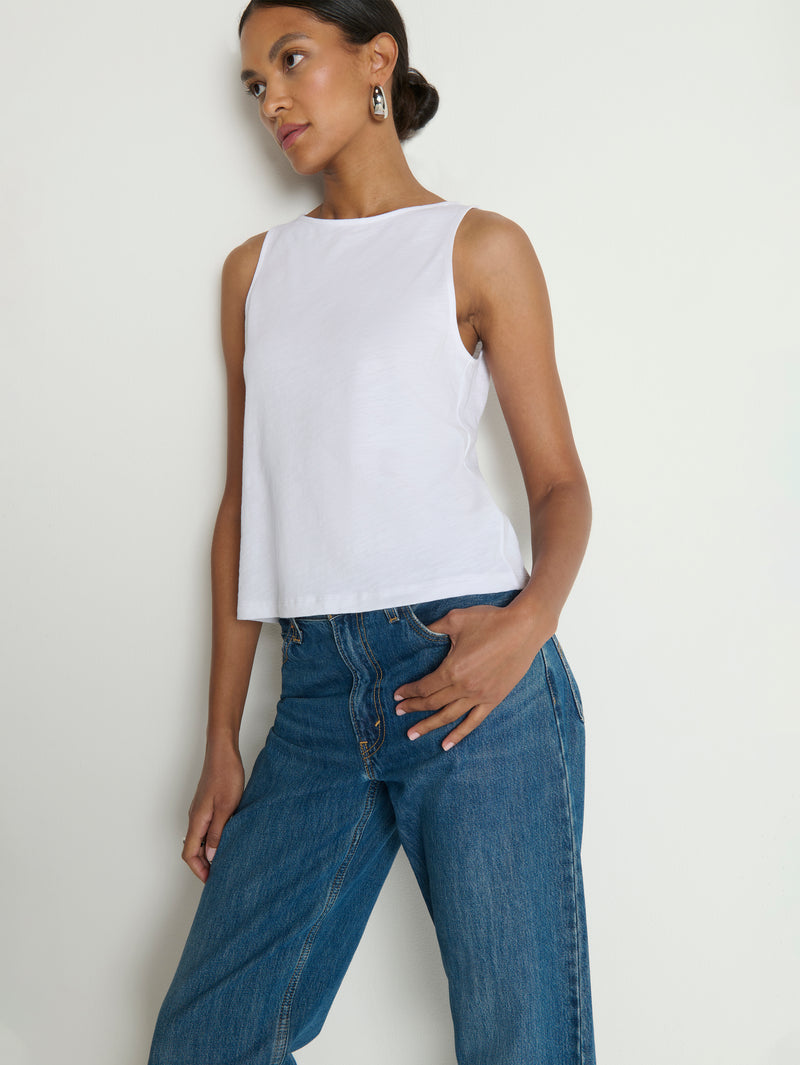 The warm-weather essential gets a playful twist. Sammi is sleeveless with a clean front and a bow detail in the back. Made from textured jersey, it’s effortlessly fun—perfect for easy days that call for a little something extra.