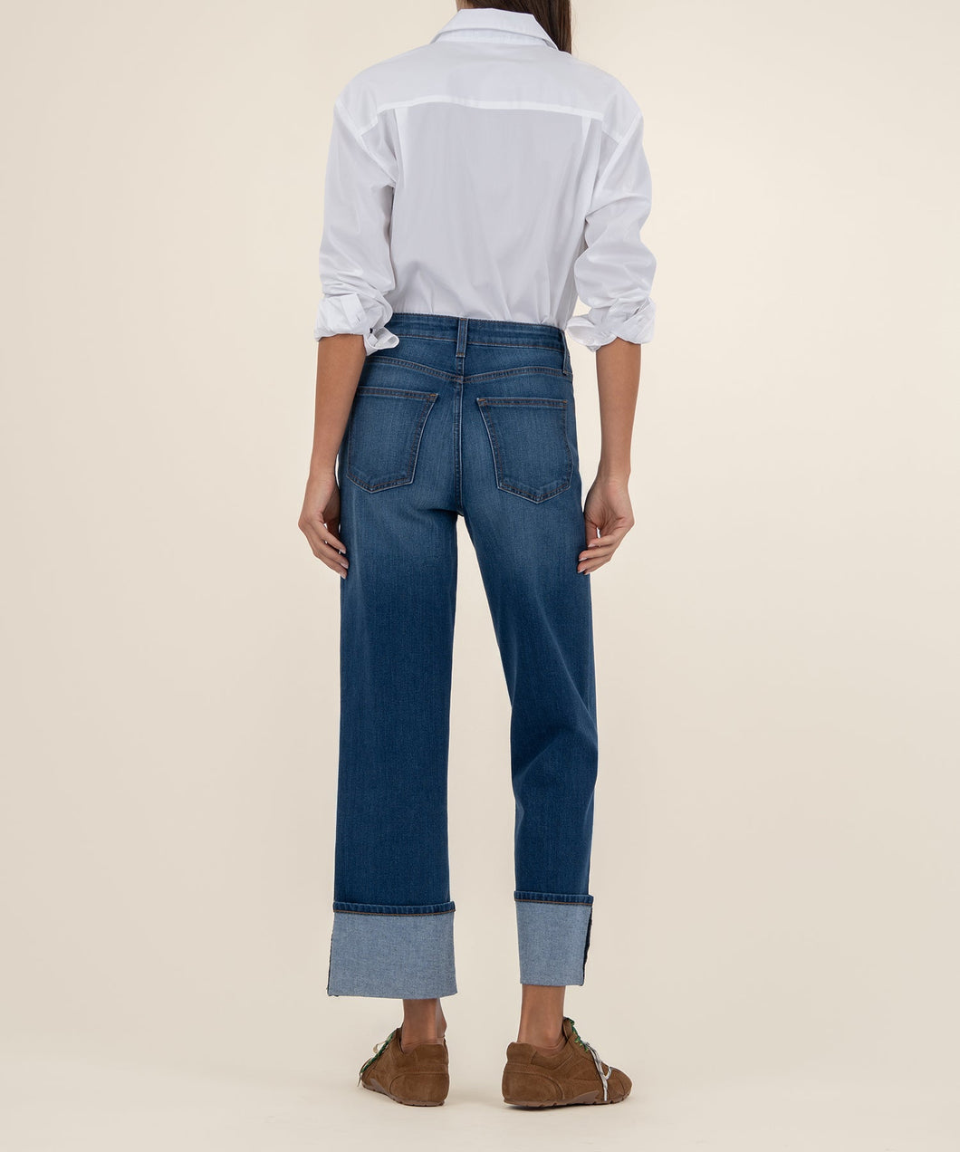 • Step into comfort with these high-rise straight leg jeans featuring a roomy fit and stylish wide roll-up cuffs. Crafted in a classic dark wash with stretchy material, they offer effortless style and all-day ease. Perfect for a laid-back yet polished look.