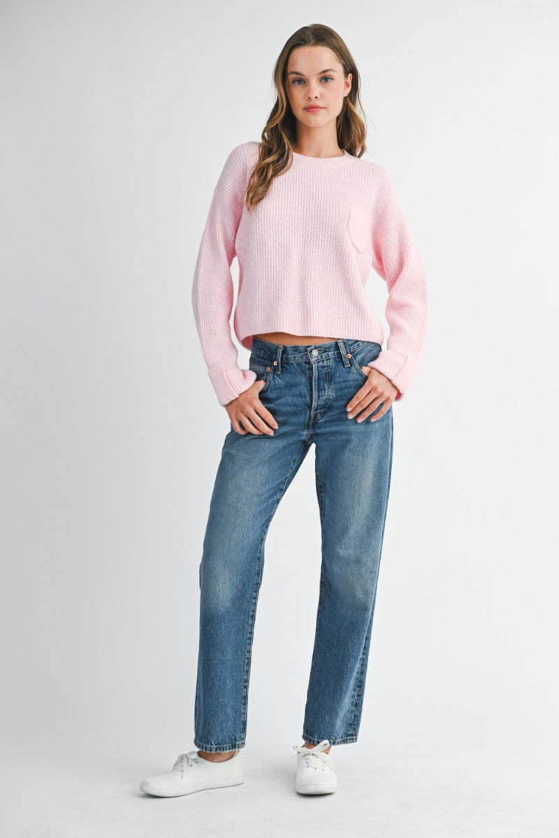 Solid crew neckline long sleeve with fold cuff detail knit pullover sweater top. Front chest pocket detail.