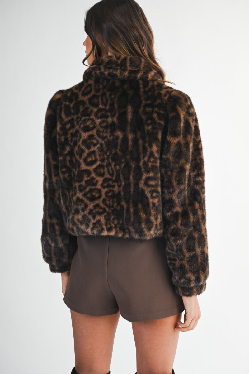 Leopard faux fur collar long sleeve front hook and eye closure crop jacket. Lining.