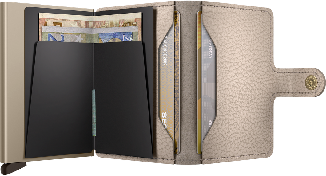 Small in size and surprisingly large in storage capacity, the Miniwallet combines the best of both worlds. The exterior holds banknotes, receipt and cards, while the aluminium Cardprotector allows you to slide out cards with one simple motion and protects them from bending, breaking and unwanted wireless communication.