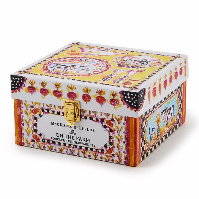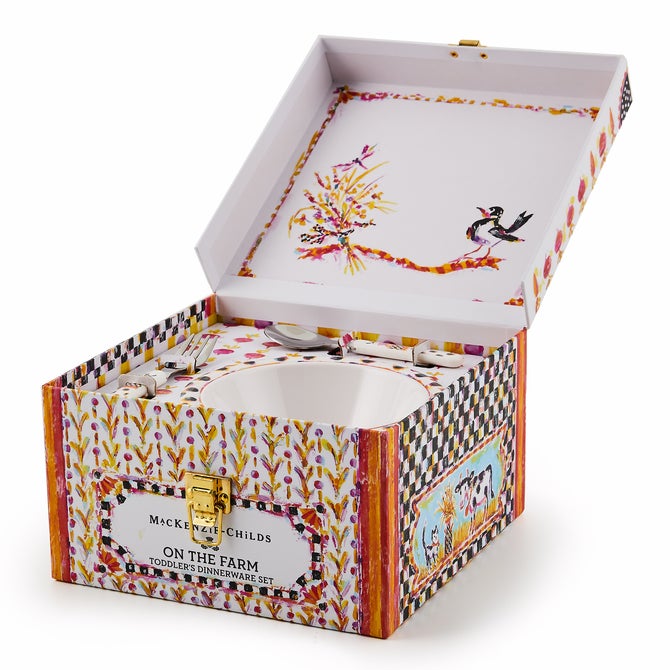 Make mealtime fun with our happy designs. Each On the Farm Toddler’s Dinnerware Set includes a BPA-free melamine sectional plate, bowl, and two-handled sippy cup, plus a fork and spoon, all nestled in an extra-special matching gift box with latch closure.