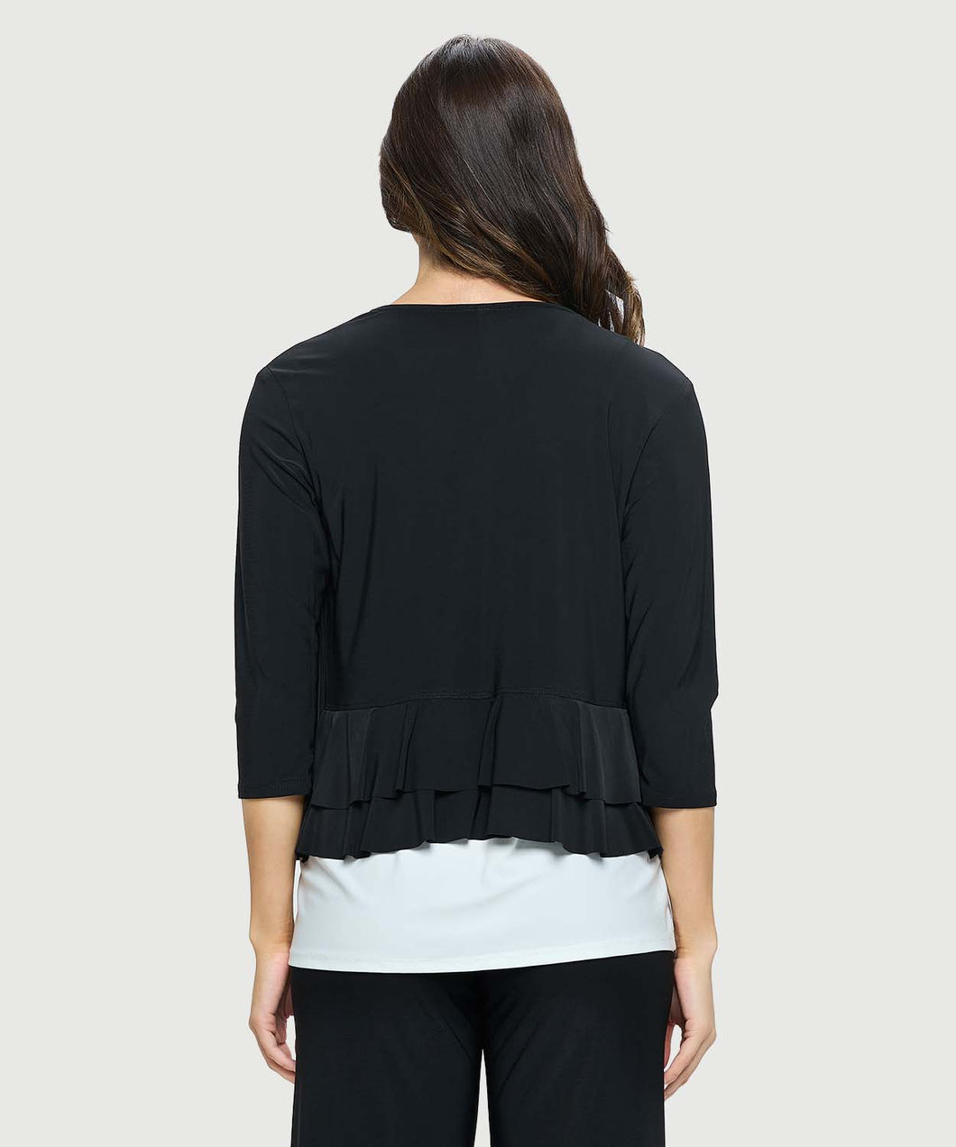 DETAILS: Open Front Jacket, Ruffle Panel Detail, Elbow Sleeve