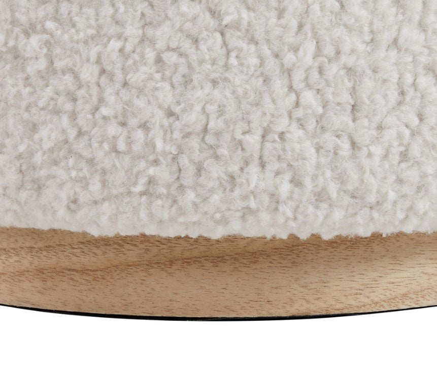 Multifunction never looked so good. This space saving piece offers a comfortable place to sit or rest your feet, and it provides convenient storage under the removable lid. Natural wood trim accents the comfy natural Sherpa fabric that covers the top and side panels. The finished storage area is great for shoes, blankets or remotes. Use next to your favorite chair, desk, make up vanity or anywhere an extra seat or foot stool are needed.