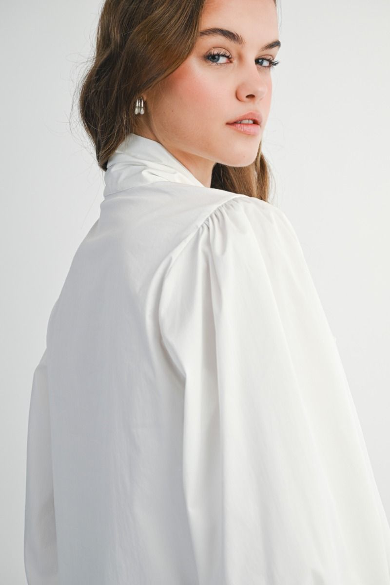 Button-down blouse with oversized bow tie at neckline, voluminous puff sleeves, button front closure, and cuffed sleeves.