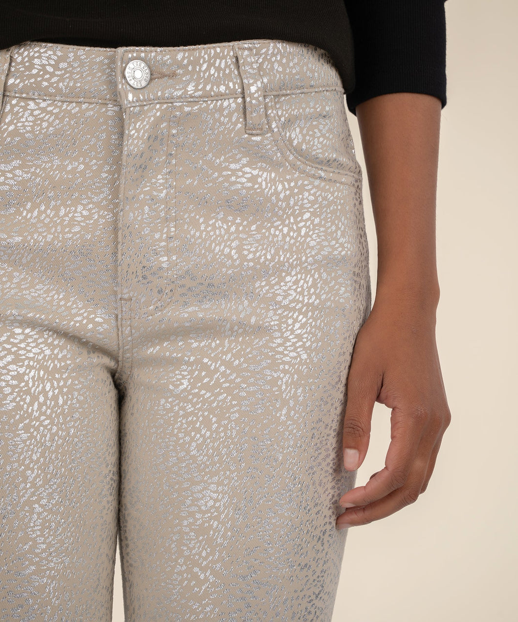 • Shine bright this season in our high-rise cigarette leg pants, designed with a super stretchy silver foil on twill material. With just the right amount of sparkle, they bring a bold holiday vibe to your wardrobe—perfect for parties, nights out, or festive moments that call for a little extra glam.