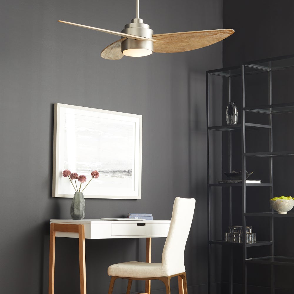 The Trinity fan combines the best of both worlds with its modern form and classic, distressed finish. The blade sweep extends 52 inches at an 18-degree pitch. Each blade boasts a Weathered Oak finish for that quintessential rustic look. The motor frame sports a nice contrasting Satin Nickel finish. This contemporary three blade design features graceful curves that provide a breezy airflow perfect for any boho-chic, eclectic, or modern farmhouse space. An LED light kit is included on this fan for added versatility and functionality.