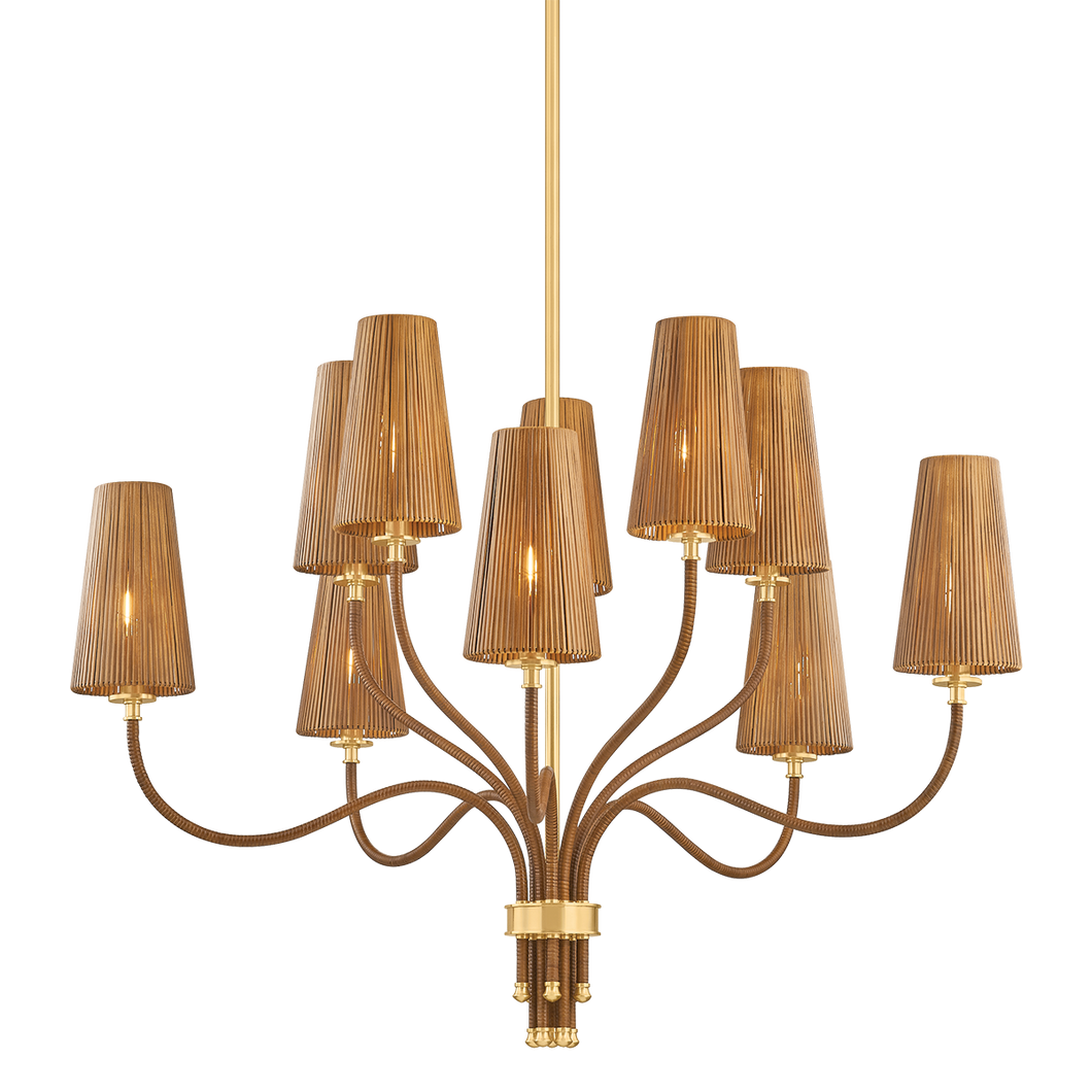 Elongated arms and tapered shades are wrapped in rattan skin, creating an earthy, global statement. The metal rod, bobèches, and cuffs are finished in Aged Brass, lending a luxurious feel.