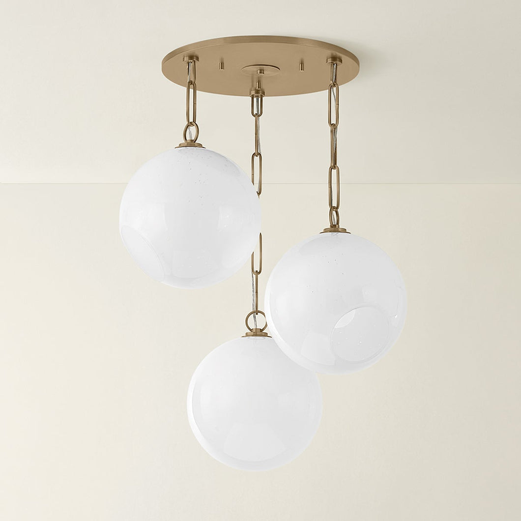 The Bramble pendant features an asymmetrical design with clear seedy cloud glass globes intentionally suspended off-axis. The unique orientation of each shade directs light outward while adding a dynamic, sculptural quality to the composition.