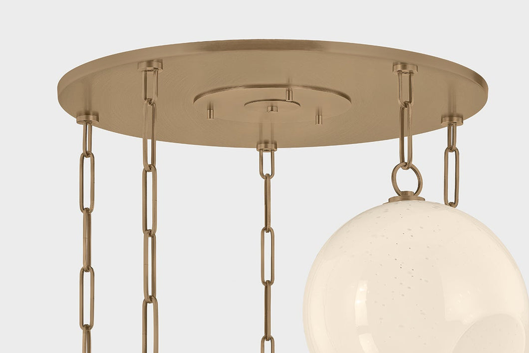 The Bramble pendant features an asymmetrical design with clear seedy cloud glass globes intentionally suspended off-axis. The unique orientation of each shade directs light outward while adding a dynamic, sculptural quality to the composition.