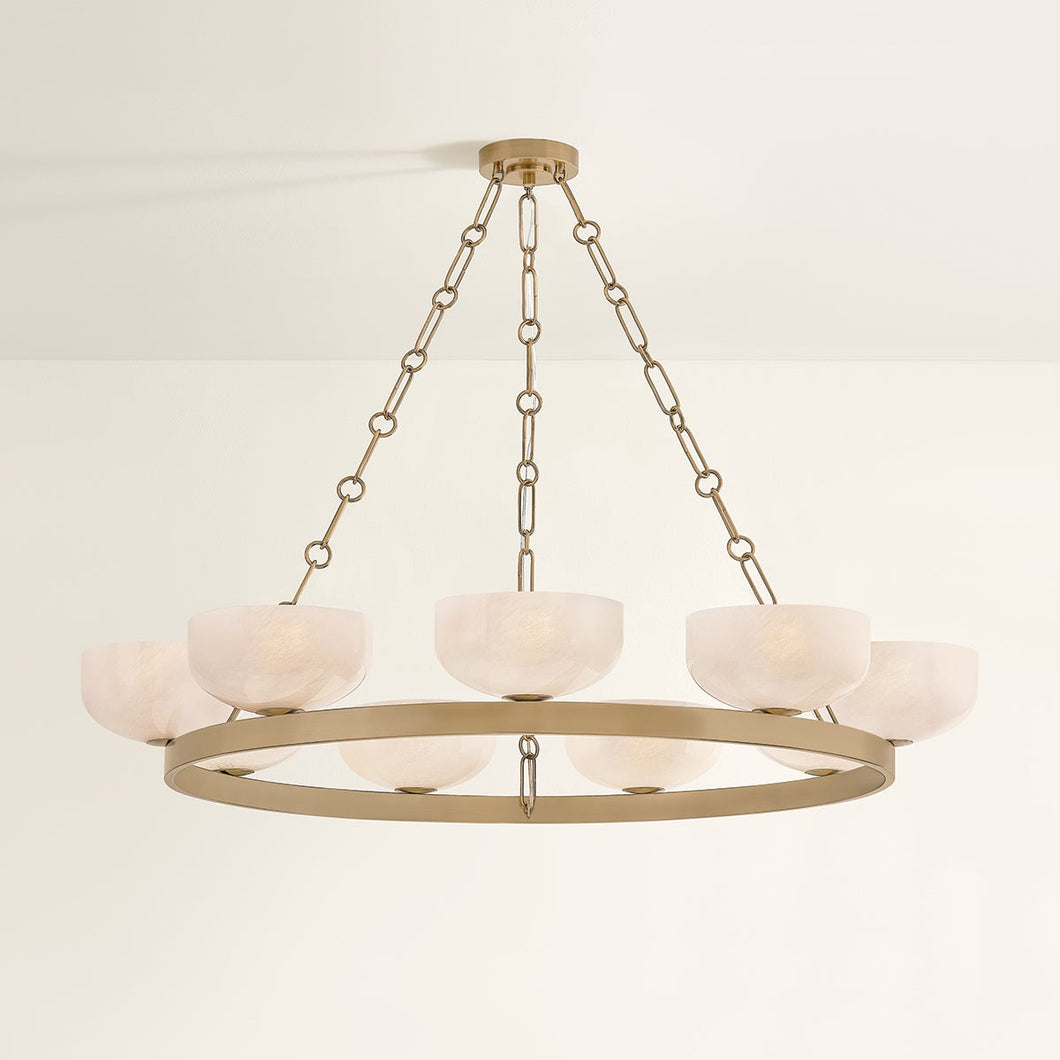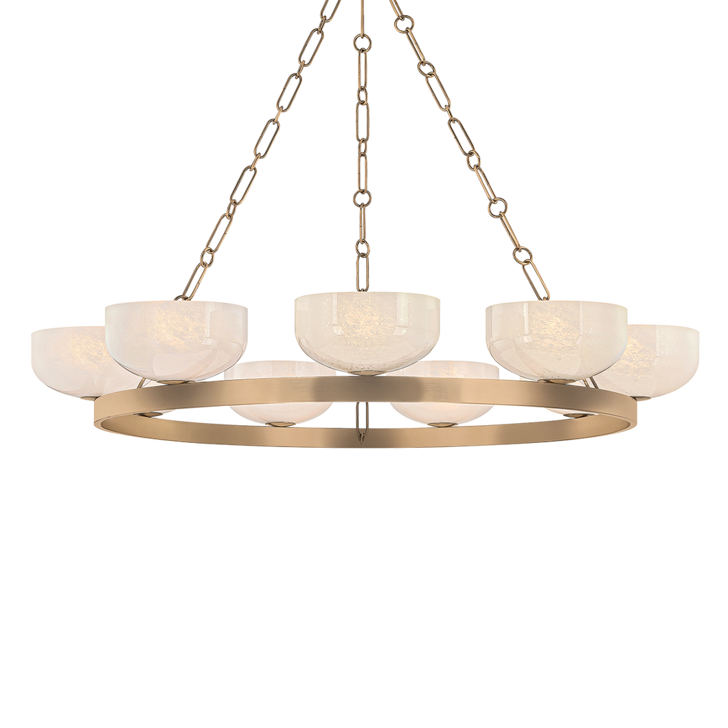 The innovative design details of Caelum modernize a classic ring-chandelier silhouette. Seedy cloud glass bowls perch closely along the frame to create a luxe, maximalist feel. The unique elongated rod and hook suspension feel equally dainty and industrial. Finished in Patina Brass.