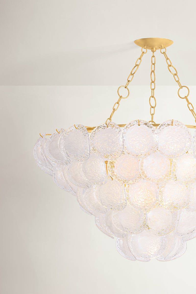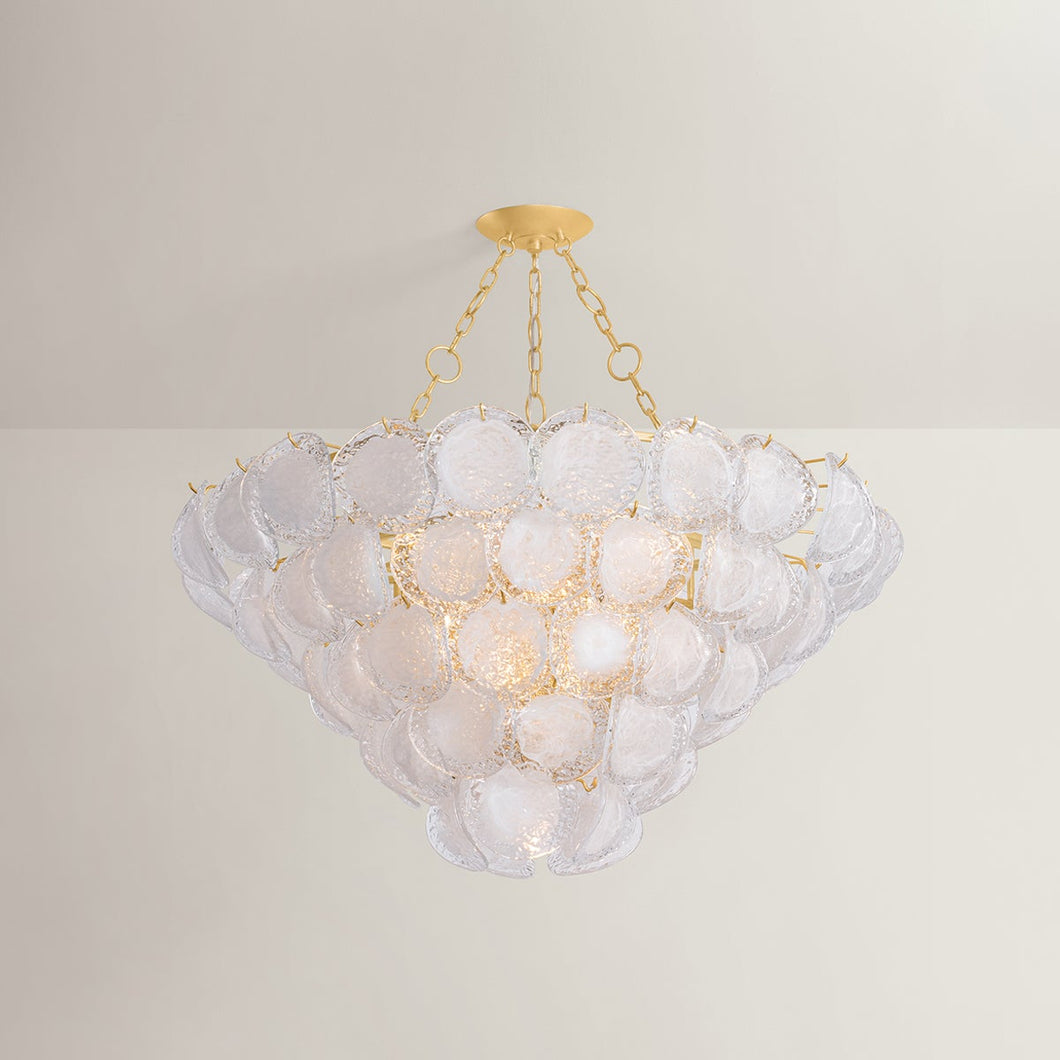 A celebration of maximalism, Cedar Hill is a whimsical tiered showpiece composed of painterly glass panels. Each suspended panel of Blonchino piastre glass curls slightly outwards, adding volume to the composition. Viewed from the side, Cedar Hill recalls a cluster of grapes on the vine; from below, it blooms like a rose.
