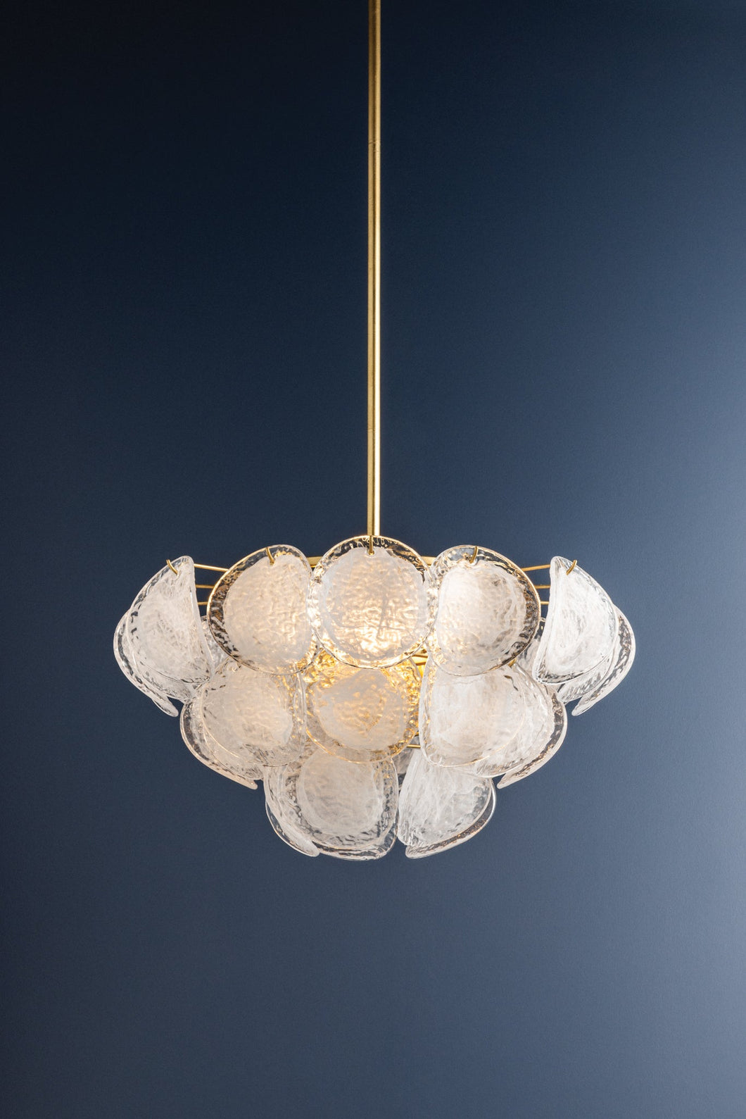 A celebration of maximalism, Cedar Hill is a whimsical tiered showpiece composed of painterly glass panels. Each suspended panel of Blonchino piastre glass curls slightly outwards, adding volume to the composition. Viewed from the side, Cedar Hill recalls a cluster of grapes on the vine; from below, it blooms like a rose.
