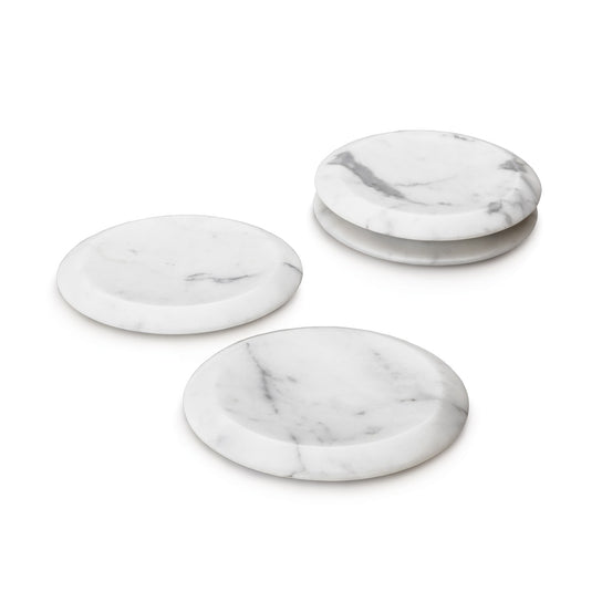 Protect your table with this set of four beautiful carrara marble coasters, handmade just for us. This natural material features beautiful textural variations, making each of the four coasters inherently unique. Our exclusive design.