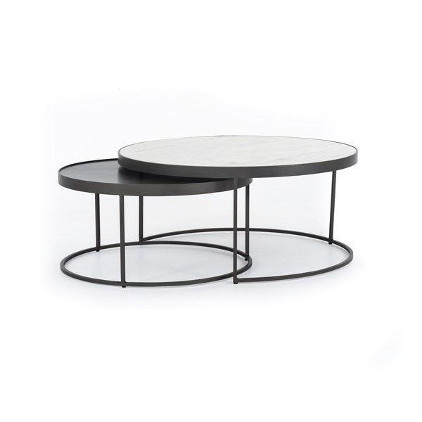Stacked and structured, slim iron lends edge to the sophistication of polished white marble. Nesting feature for compact functionality and modern, adaptable appeal. Large table measures 36"W x 36"D x 16"H. Small table measures 28"W x 28"D x "14"H.