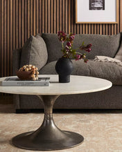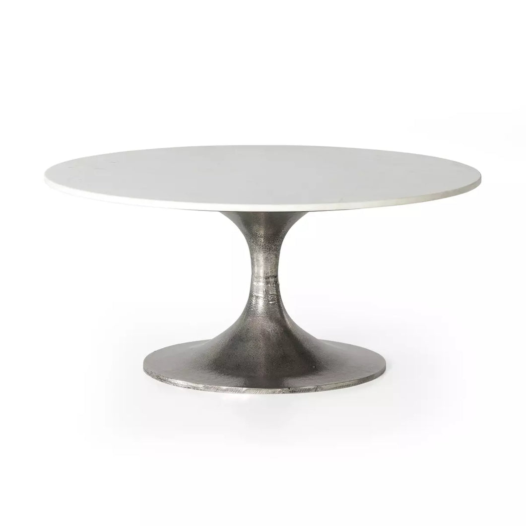 Classic tulip shaping in a textural cast aluminum crafts a shapely coffee table. Alluring highs and lows are played up by a raw nickel finish. A rounded top of solid white marble makes for a modern material mix. Overall Dimensions 38.00"w x 38.00"d x 17.00"h