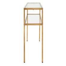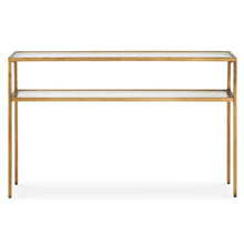 The simple profile of this iron console table will complement a variety of decor styles. Finished in a warm gold, each shelf is adorned with tempered glass and perfect for displaying decorative accents. The second shelf is approximately 7.5" below the bottom of the top shelf. The depth of the table allows ample space for displays but appropriate for entryway, hallway or living room.