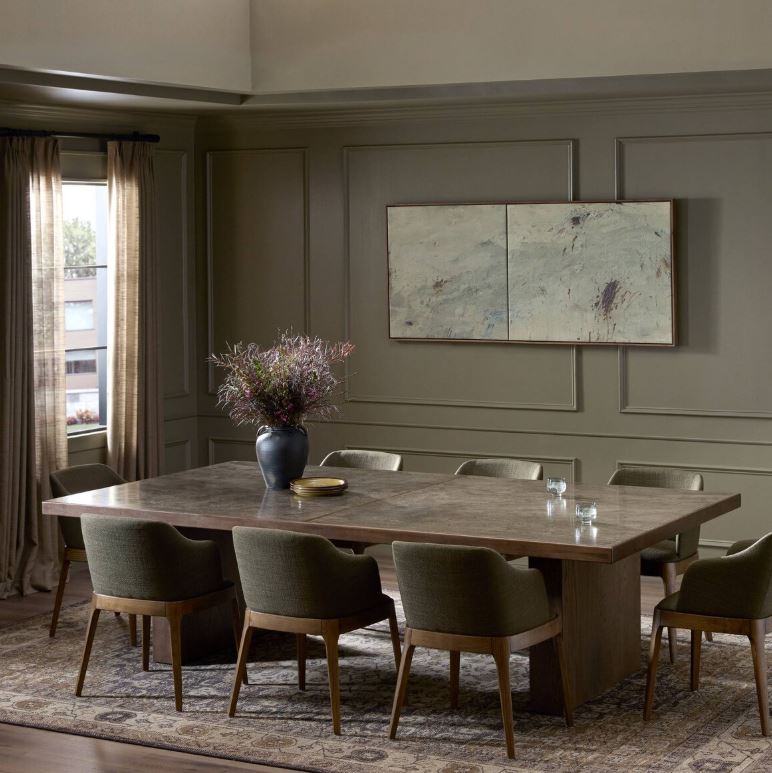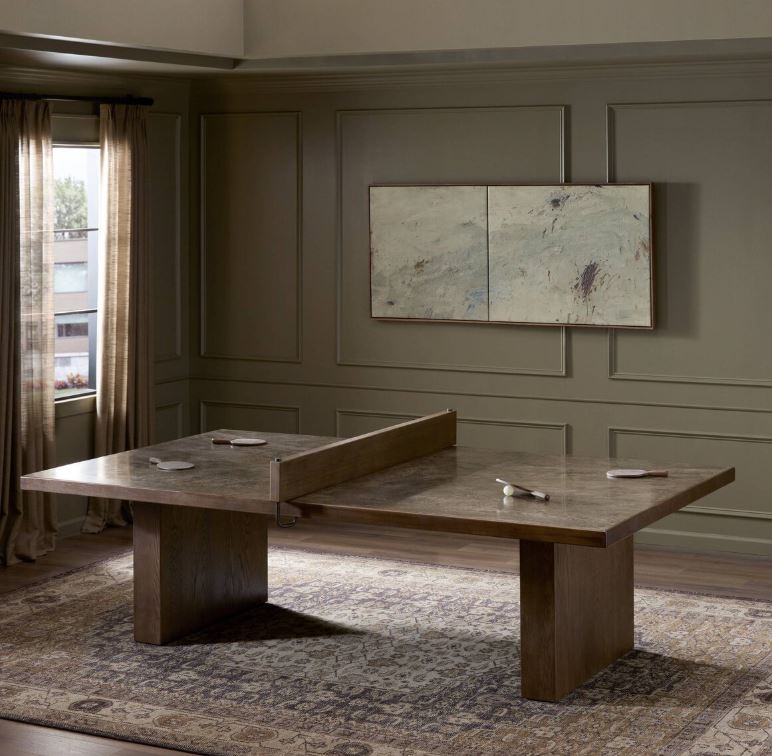 Fun meets flexibility. Two large slabs of warm grey marble, framed in rich oak, join together and sit atop the minimalist plinth bases of this dual-purpose ping pong table. The wooden "net" fastens to the table with custom gunmetal clamps, which can be easily removed for a dining table that seats 12.