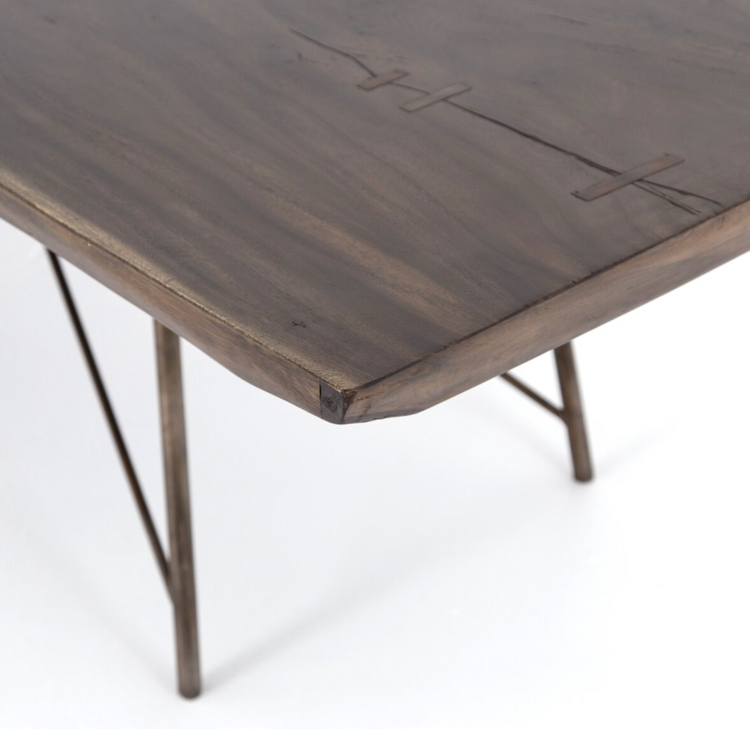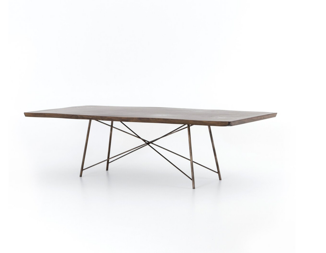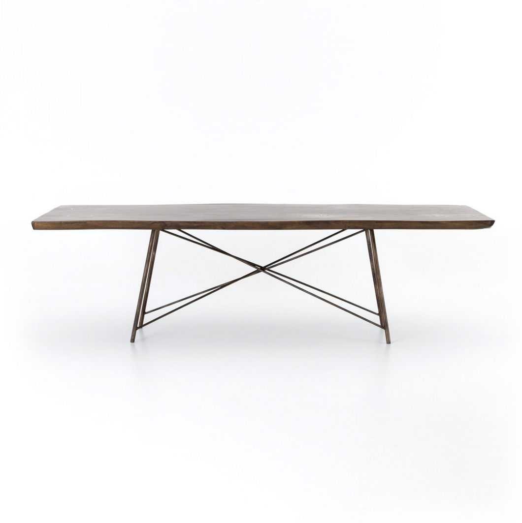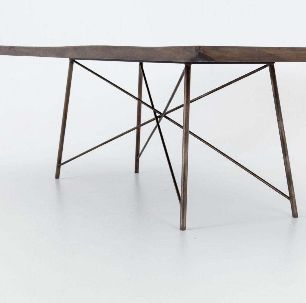 X marks the spot. A bronzed iron base strikes a spare, geo-inspired shape to support a top of smoked saman, bringing an intriguing contrast of texture and trend to the dining table.