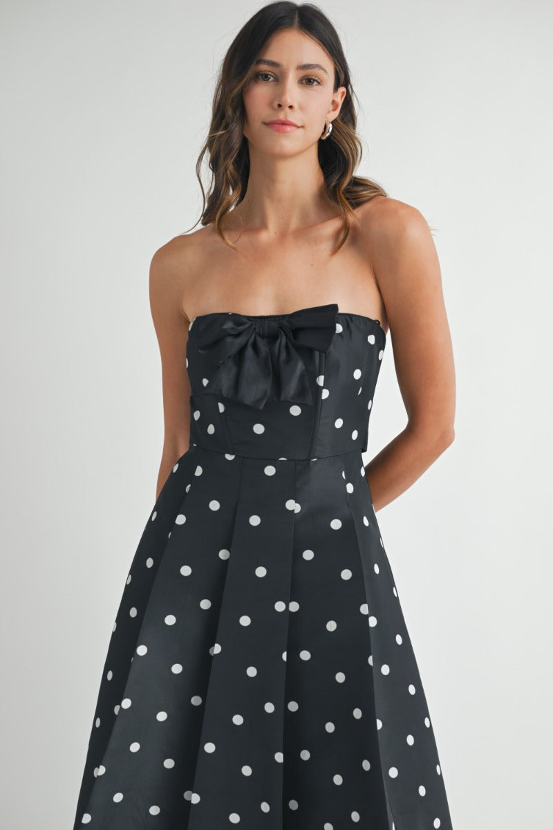 The Strapless Polka Dot Bow Dress features a timeless design ideal for formal occasions. Its elegant strapless neckline highlights the shoulders, while the playful polka dot pattern adds a touch of classic charm. The bow detail enhances femininity and sophistication, making this dress a standout choice for any upscale event.