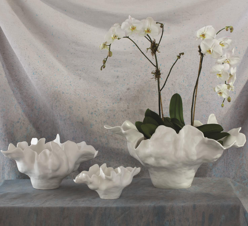 Based on the popularity of our Meteor Bowls, we have created two new sizes and a new color. The original of this grand statement piece was created by a Portuguese artist whose work first caught our designers' eyes at an art fair in Portugal. It took years of collaboration to arrive at this design that can be consistently produced. Multiple pieces are cast, bound together, and fired. Then it receives a reactive glaze and is fired a second time. There is a tremendous amount of artisan work that goes into every piece. Entire rooms could be designed around this beautiful and functional sculpture.
