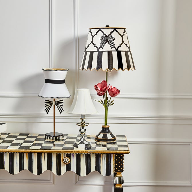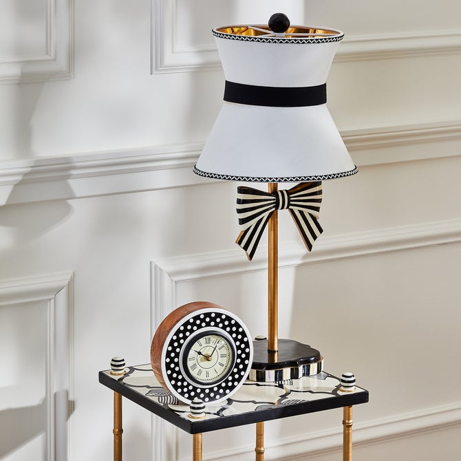The aptly named Pretty as a Bow Table Lamp is all sweetness and light, wrapped in simple but stylish black and white. Its base features a hand-painted, dimensional striped bow, topped with a distinctively shaped shade, trimmed with soutache, and topped with a ceramic finial.Product #:13013-001