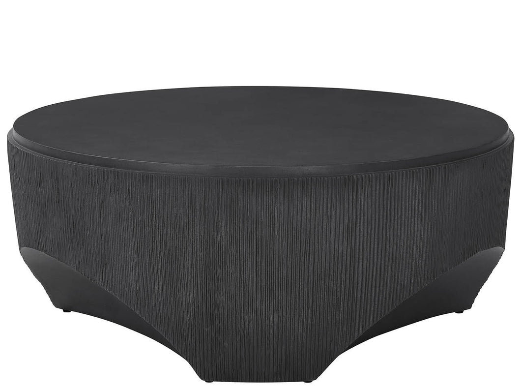 The Cinder Cocktail Table showcases innovative glass-reinforced concrete in sculptural round form with concave base carveouts. Distinctive reeded sides create dramatic texture and visual weight, representing the collection's most contemporary expression while maintaining refined aesthetic appeal.