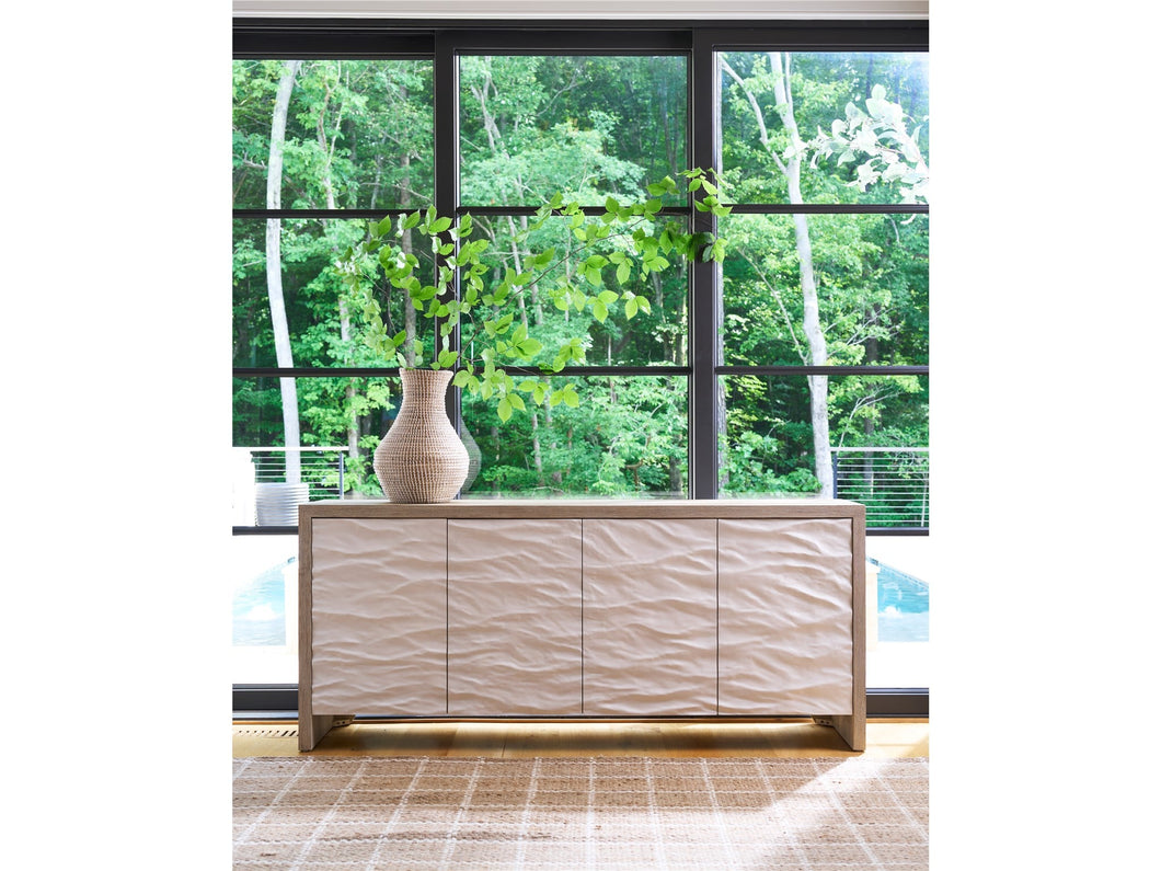 The Oasis Credenza combines a Dockside oak case with stunning white wave-patterned door fronts that reference the movement of water. Added features make this credenza perfect for dining or media storage in your coastal-inspired home.