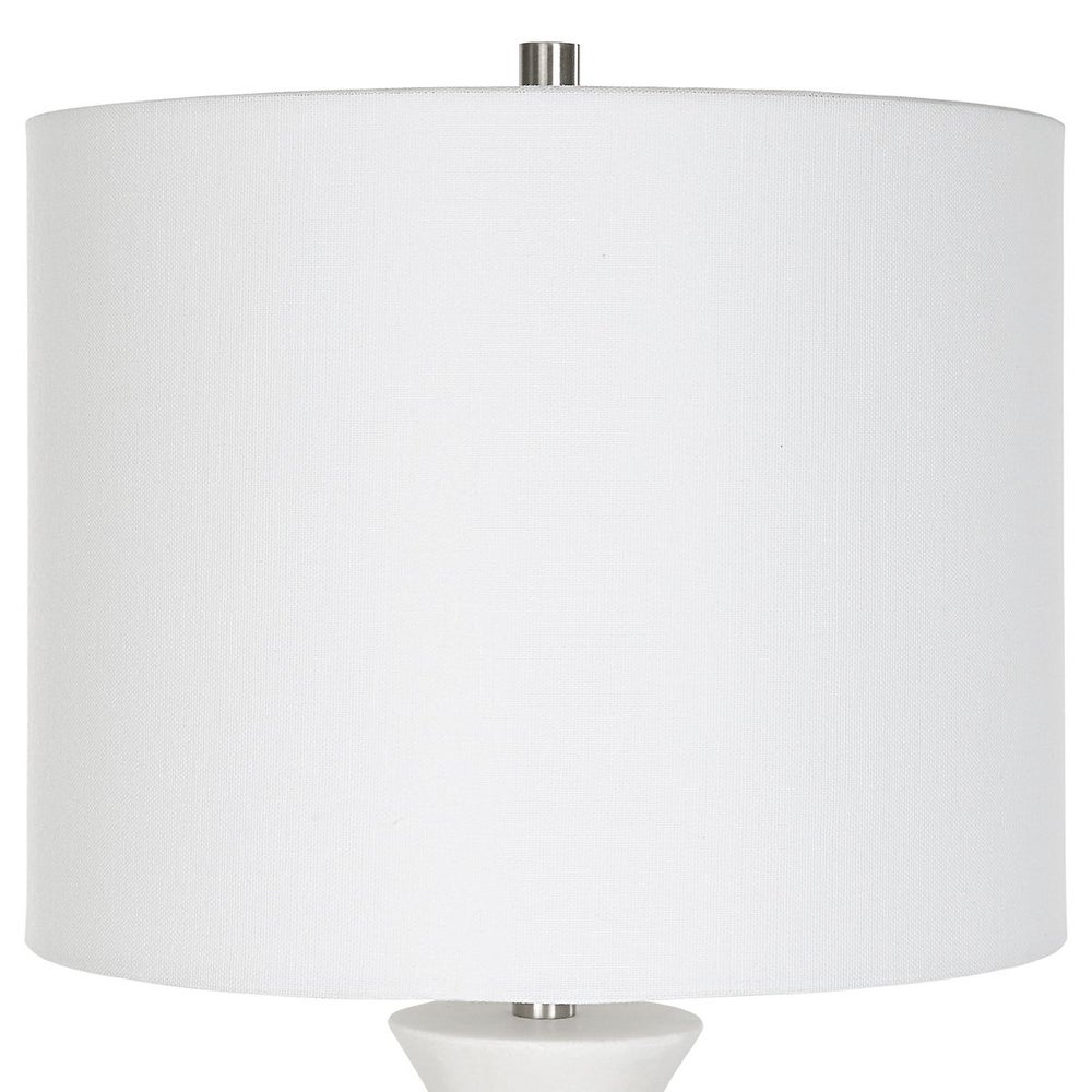 Showcasing a classic trumpet shape, this buffet lamp is handcrafted from ivory man-made stone that accurately replicates the look of Thassos marble, displayed on a thick crystal foot, paired with brushed nickel plated accents. A white fabric shade completes the piece.