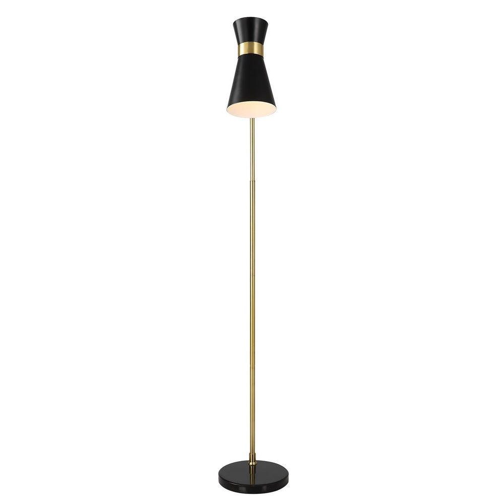 Finished in a beautiful gold, and sitting atop a black marble foot, this floor lamp features a black metal cone-shaped shade, surrounded by a gold band. The shade pivots, allowing you to focus better on the task at hand.