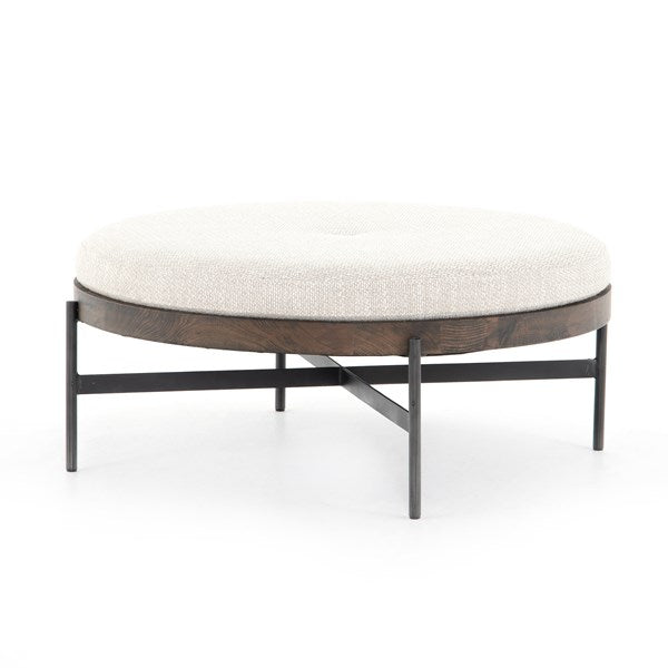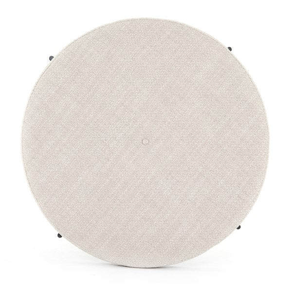 Stylish versatility. An airy base of gunmetal-finished iron supports rounded beech wood with textural wheat-colored upholstery. Perfectly scaled to create additional seating or an extra surface when topped with a tray. Performance fabrics are specially created to withstand spills, stains, high traffic and wear, ensuring long-term comfort and unmatched durability.