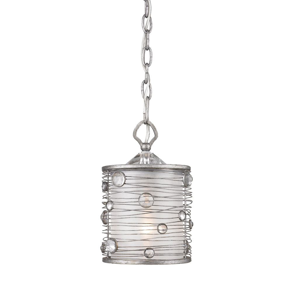 The Joia collection was inspired by jewelry. Transitional in style, the fixtures are ideal for eclectic and contemporary room decors. The collection is offered in multiple hand-painted finishes. The hand-wrapped wire frames are accented with crystals that glisten when lit. A fabric shade romantically diffuses the light. This mini pendant is an eye-catching accent that can be used alone or arrayed in a group. Ideal for the kitchen, the mini pendant provides soft ambient downlight, illuminating a kitchen bar or countertop without interfering with activity on the surface.Finish: Peruvian SilverGlass/Shade: Sterling Mist ShadeHeight: 11"Width: 7.25"Extends: Weight: 4.07Backplate/Canopy: 5.875''Dia x 1.5''EBulb Included: NoNumber of Bulbs: 1Socket Size: E26/MediumType of Bulb: Incandescent, Type AWattage: 60Voltage: 120Dimmable: YesWarranty: 1 Year Limited