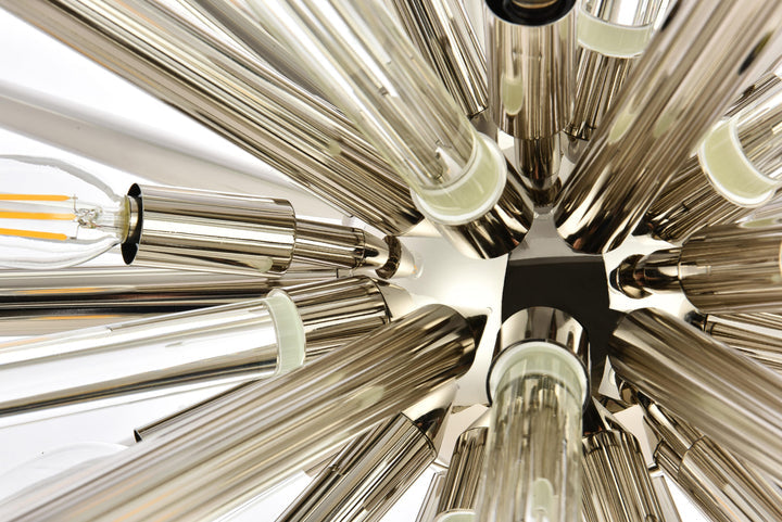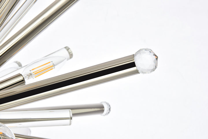 When you want dramatic, modern lighting for your home – but aren’t sure about the shape of the fixture – look into the Maxwell collection. Featuring a variety of rectangular, round, and radiating starburst styles, these fixtures include metal rods with crystal balls attached at the ends, interspersed with clear glass rods, all of which blend to create impressive visual effects. The metal-and-glass rods extending from a round polished-nickel base provide a striking profile from any angle. Dazzling light is created by 14 energy-efficient LED candelabra bulbs.
