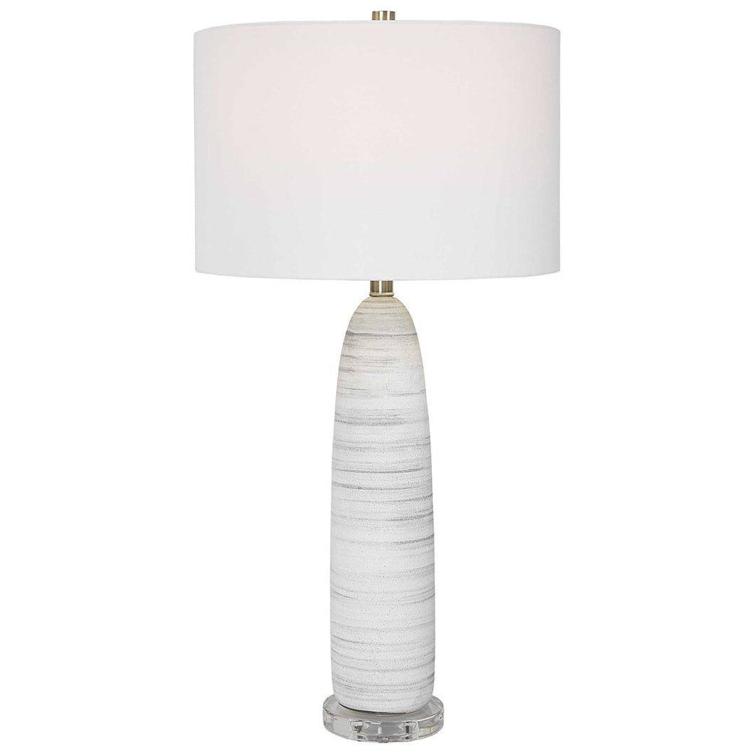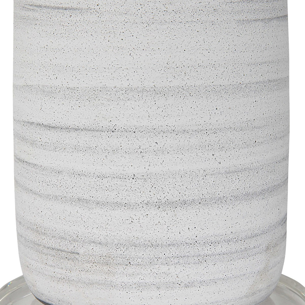 This sleek ceramic table lamp features a matte white glaze with brushed light gray detailing, paired with brushed nickel plated accents and a crystal foot. A white fabric drum shade compliments the piece.