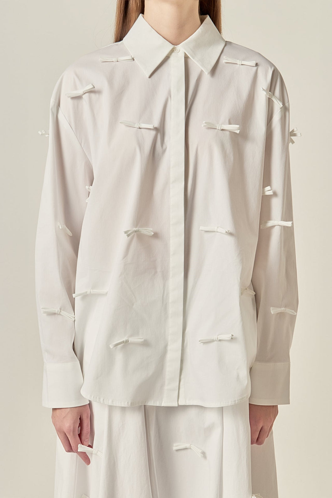 The Bow Detailed Drop Shoulder Shirt adds a feminine twist to a classic silhouette with delicate bow accents throughout and a relaxed drop-shoulder fit. Crafted from soft, lightweight fabric, it drapes effortlessly for a polished yet comfortable look. Perfect for dressing up or down, this versatile piece pairs beautifully with tailored trousers for the office or a skirt for an elevated everyday outfit.