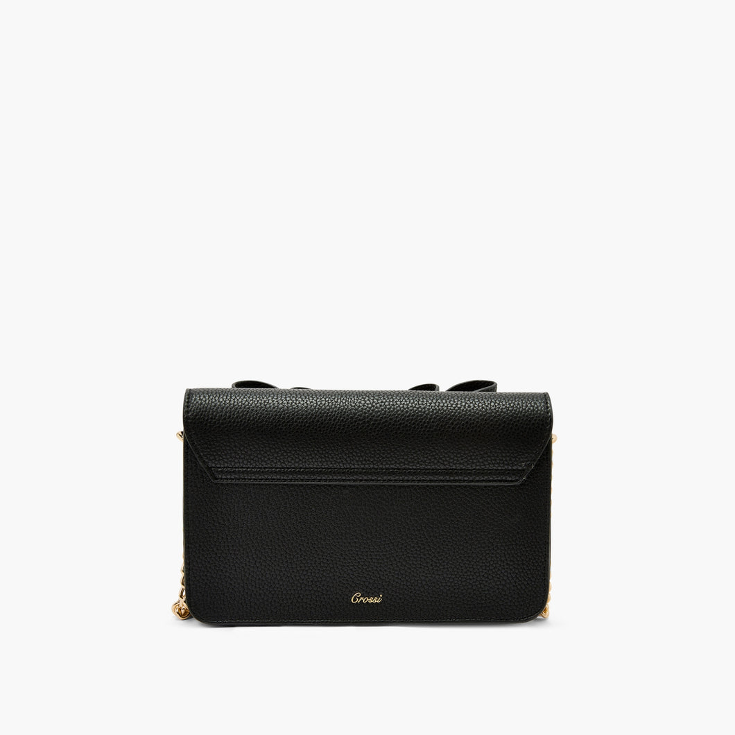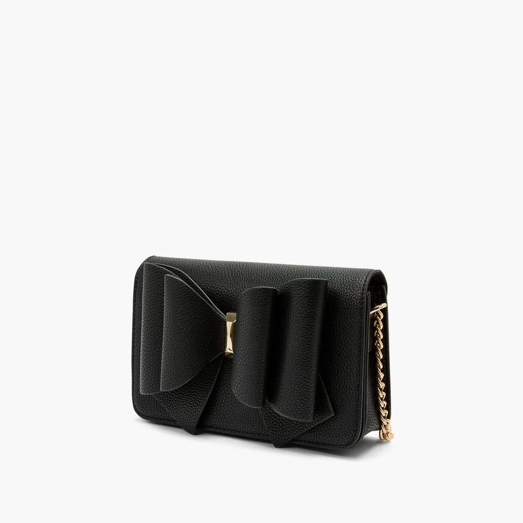 Elevate your Fall and Winter outfits with the Jane Overflap Bow Crossbody Handbag. Crafted from premium pebbled vegan leather, this medium-sized shoulder bag features a signature double bowtie design and an elegant overlay flap with a secure magnetic snap closure. Gold hardware accents the chain-link meshed strap for a sophisticated touch. Compact yet spacious, it comfortably stores your phone, wallet, and other daily essentials like hair clips or sunglasses, making it perfect for holiday outings, casual events, or everyday wear. Details: Material: Vegan Leather Dimensions: 9W x 6 H x 3 1/2 D Strap: 24 Long Chain-Link