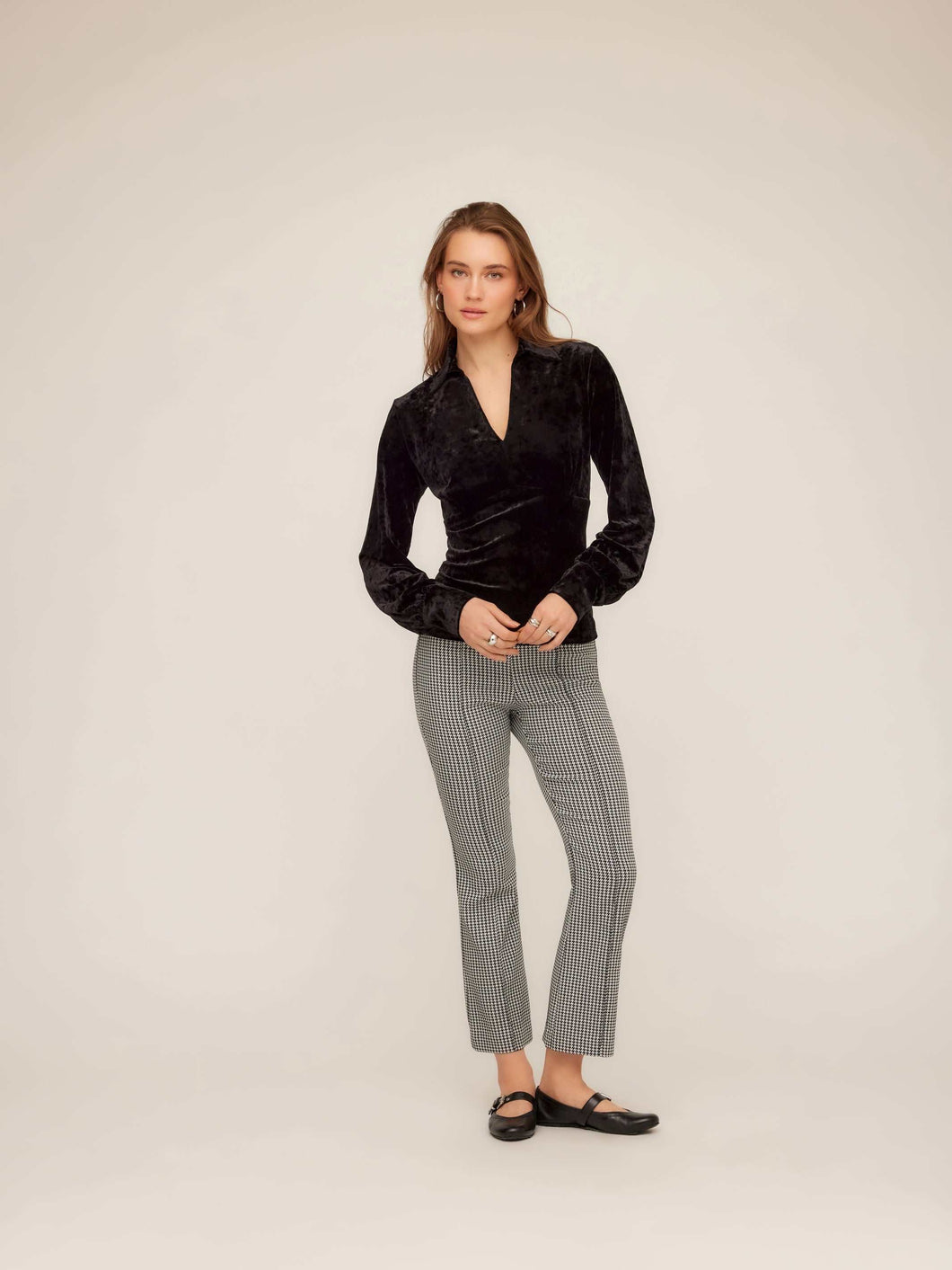 The Bianca Top features a sharp collar and deep V-neckline that adds structure, while delicate shirring at the bust and subtle gathers above the cuffs bring soft, feminine detail. Crafted from stretch crushed velvet, it’s designed as an easy pull-on style with long sleeves finished with buttoned cuffs and a slim silhouette that give it a polished feel, making it a versatile standout for elevated day-to-night style.