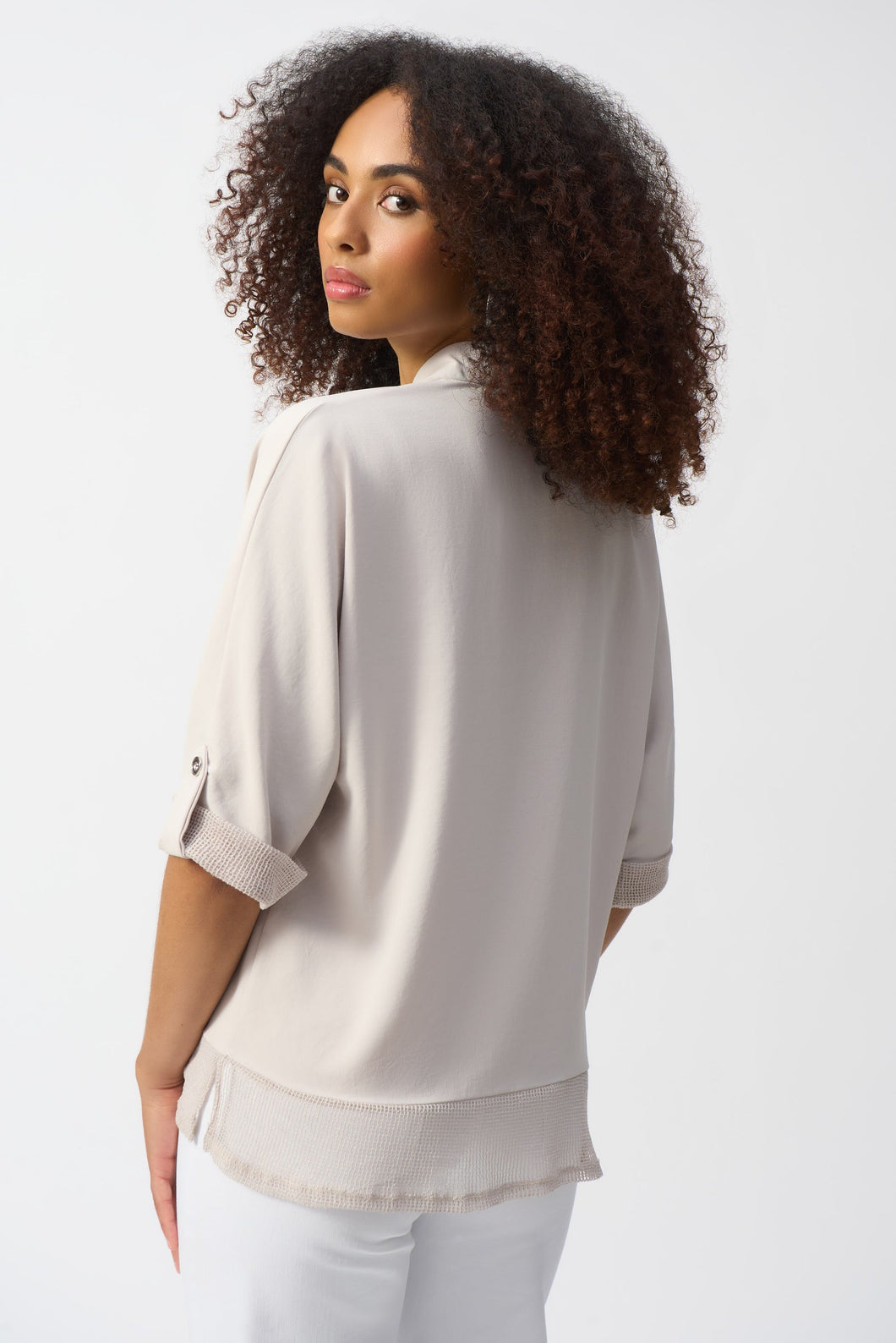 This top is a perfect illustration of finesse and relaxed style. The piece features a V-shaped neckline, adding subtle elegance to the look. The three-quarter Dolman sleeves can easily be rolled up to accentuate your comfort. The garment’s woven fabric and bouclé mesh combination at the hem and sleeve cuff elevate the top’s polished feel and lend a unique flair to this lovely contemporary design.