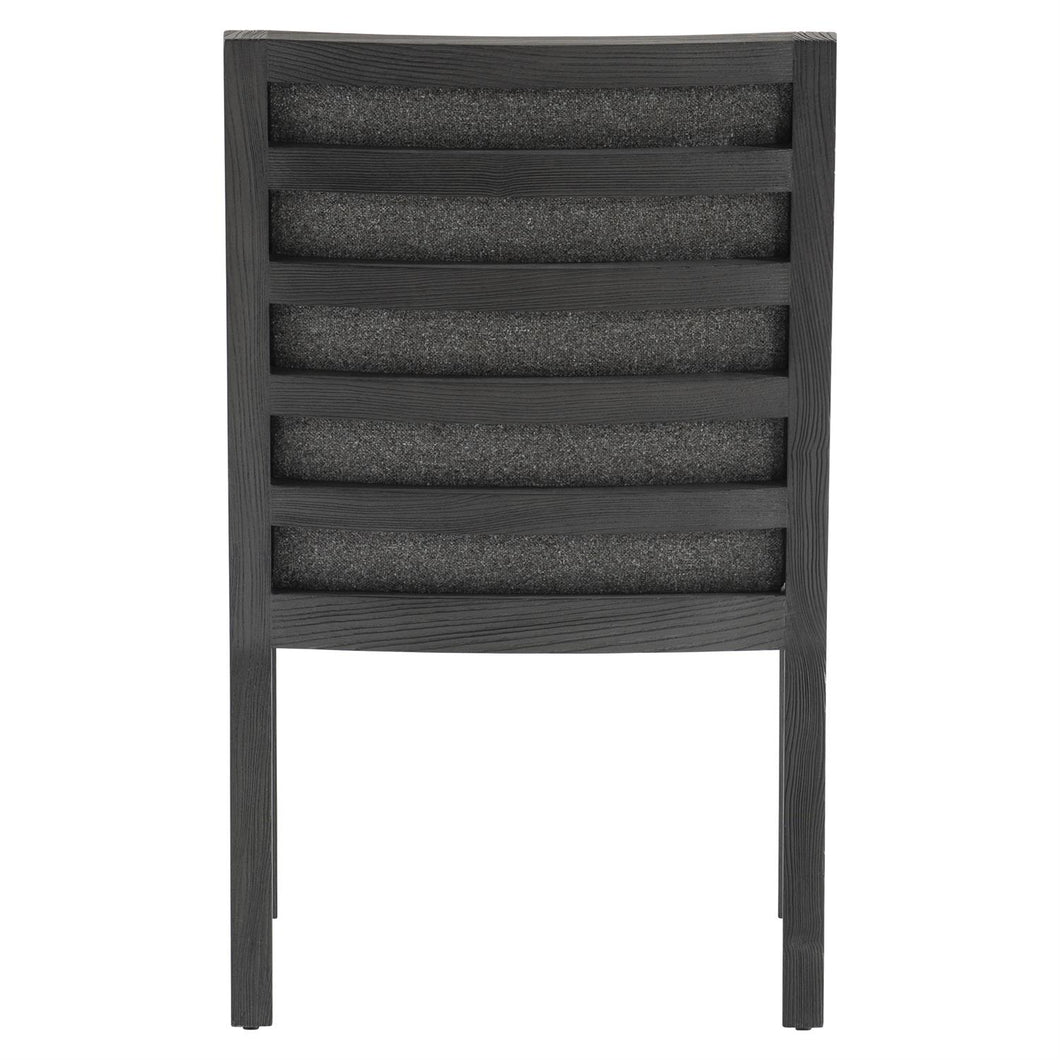 Exposed wood frame ladderback arm chair crafted from flat-cut yellow pine solids & veneers in L'Ombre finish with upholstered back and seat
