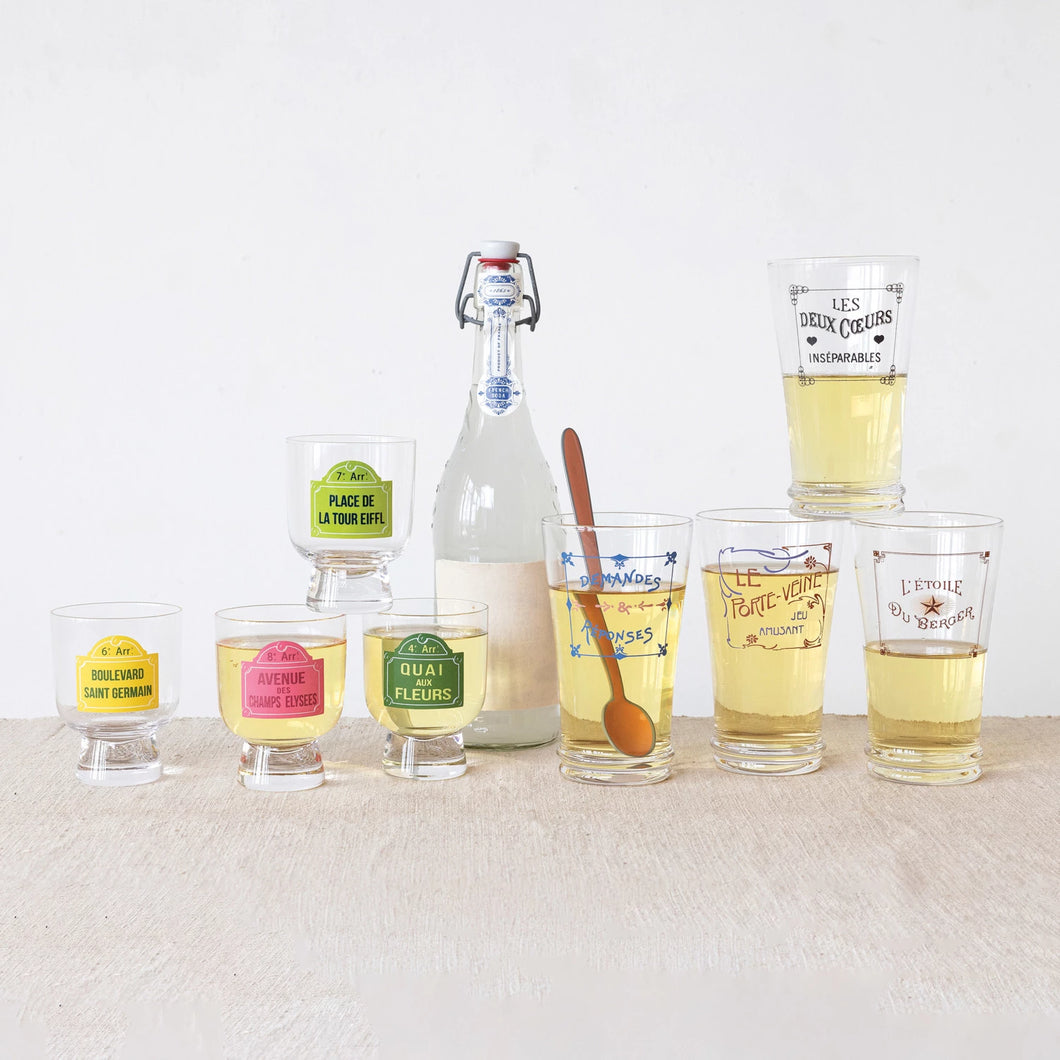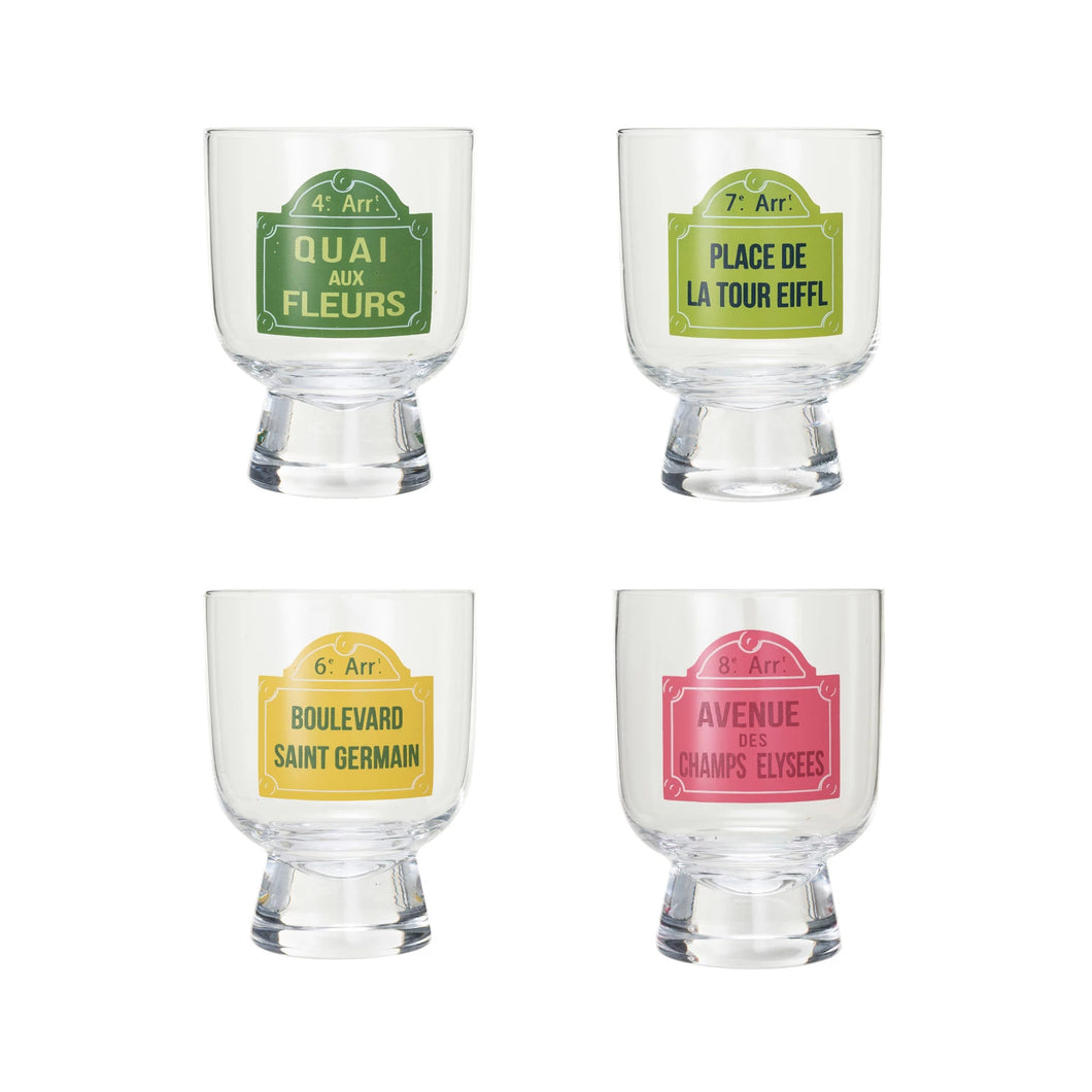 3" Round x 3-3/4"H 6 oz. Footed Drinking Glass w/ Paris Street Sign Design.