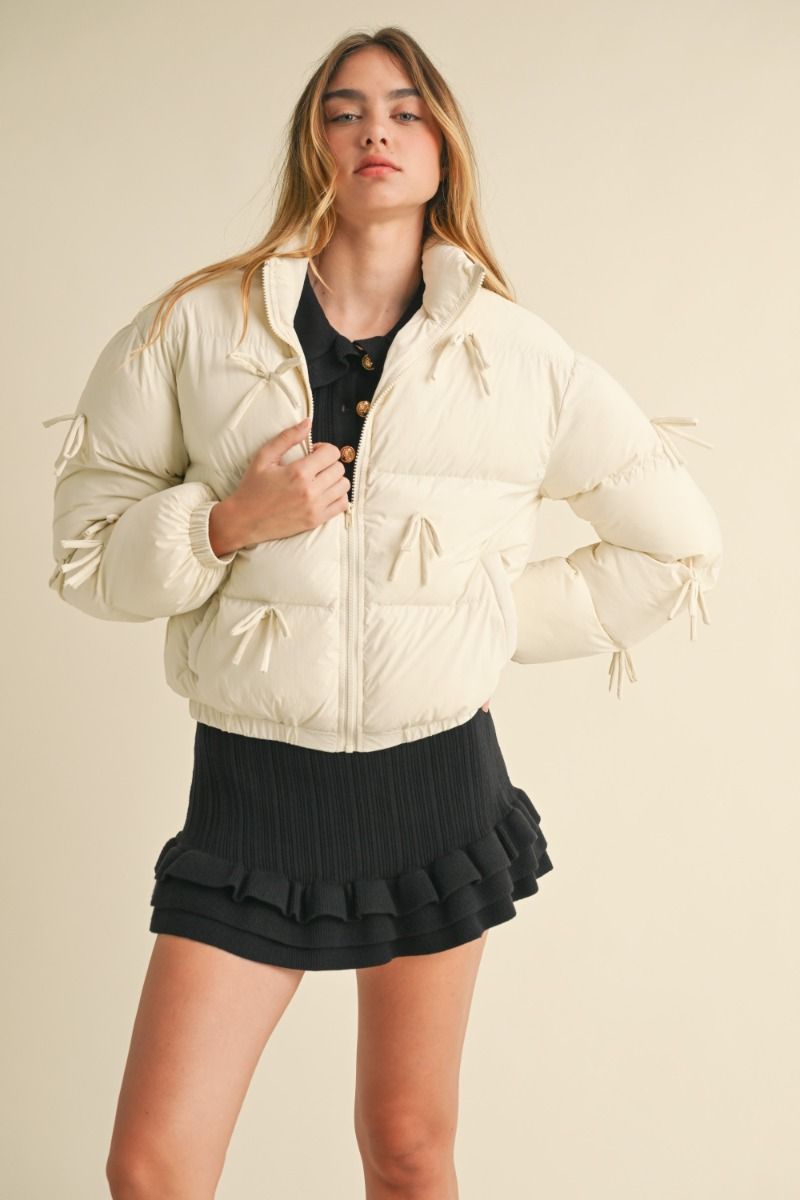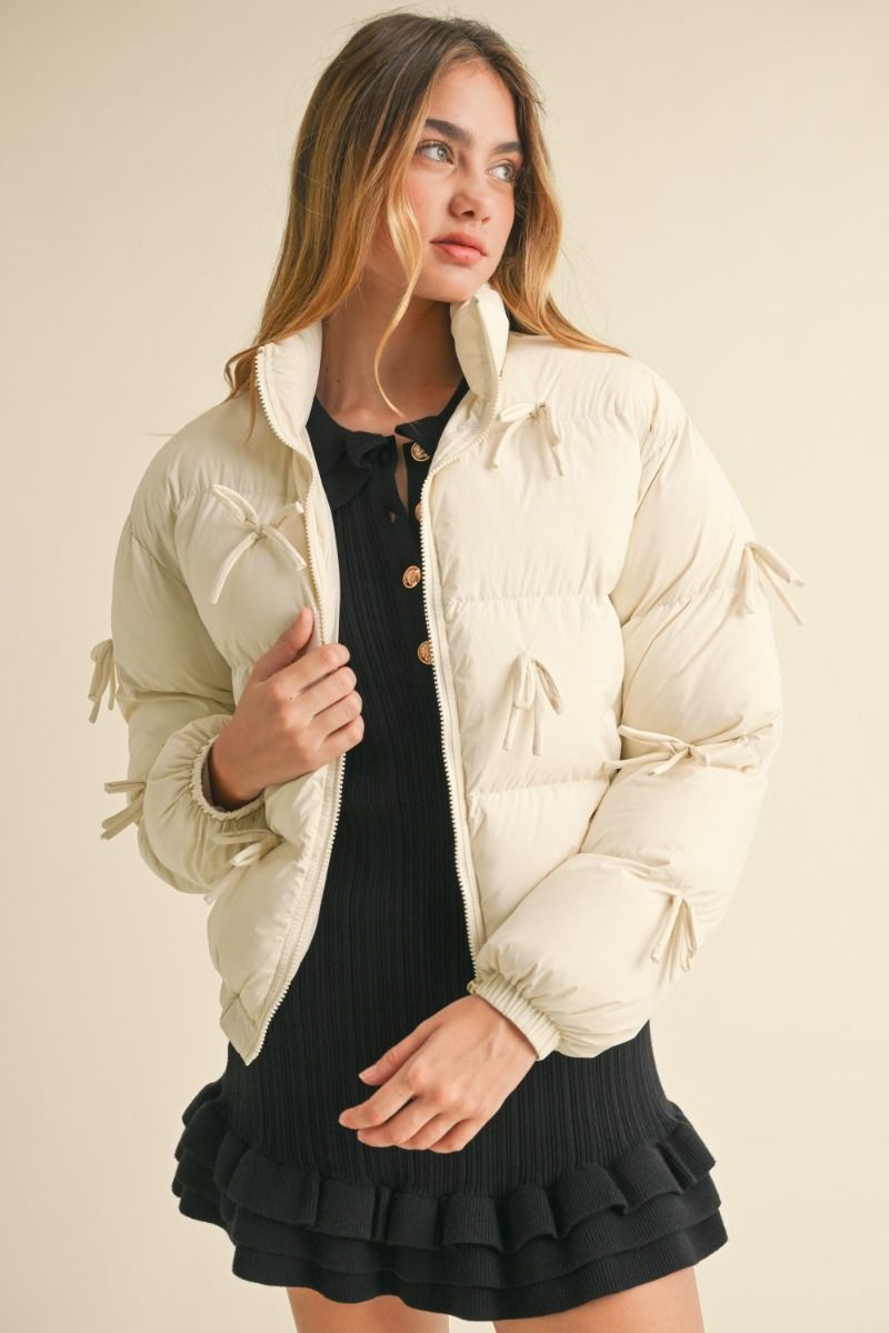Puffer jacket with front zipper and bow applique details. Side pocekt detail. Lining.