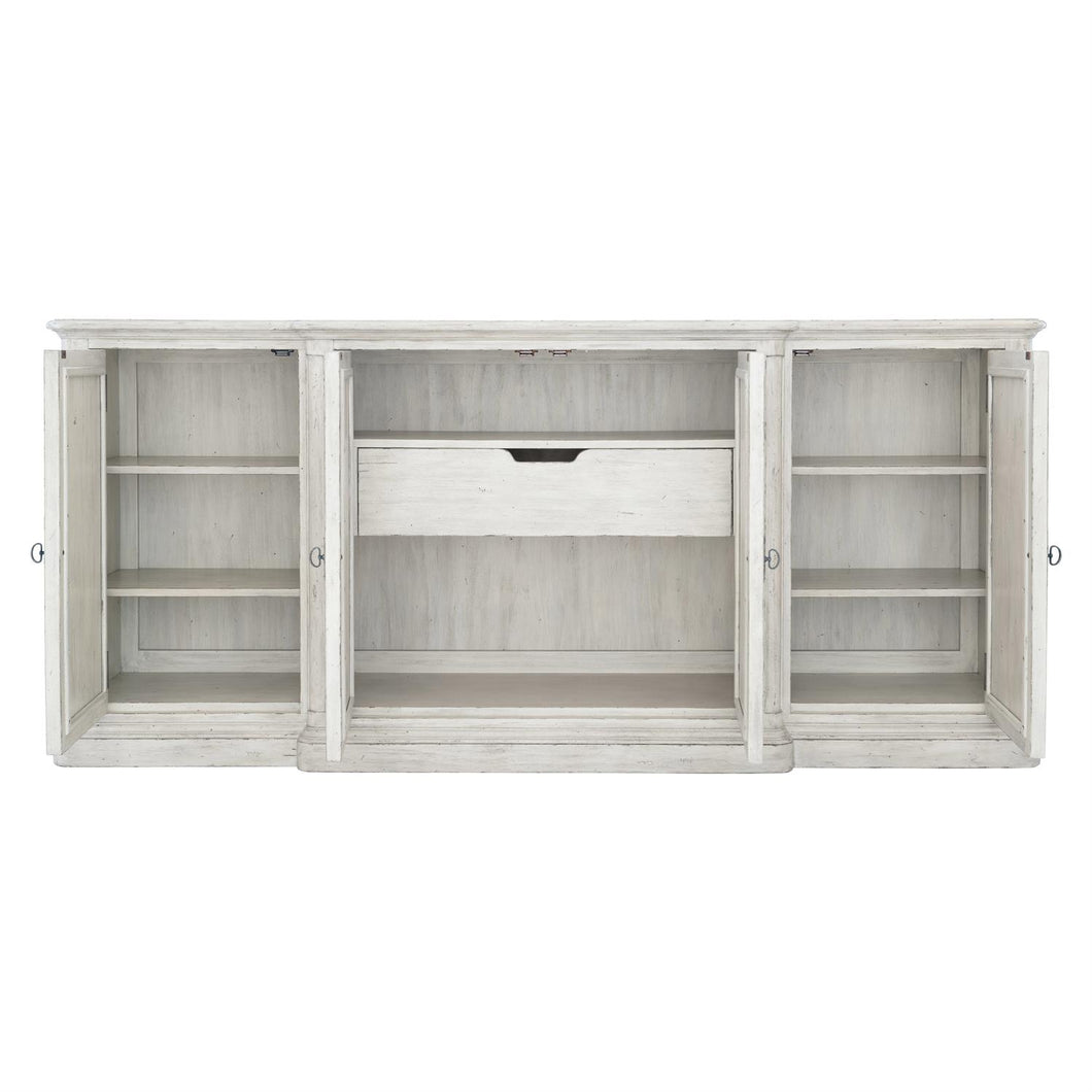 - Behind paired center doors is one fixed shelf, one drawer with wrapped pad and hand cut-out, and bottom shelf surface