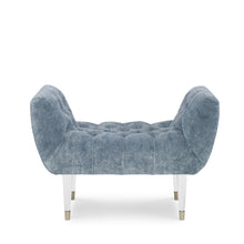 The Curve Bench with Acrylic Legs is a fully tufted bench that is raised on turned, clear acrylic legs with polished brass ferrules. The ends of the bench curve gracefully upward to create arms.